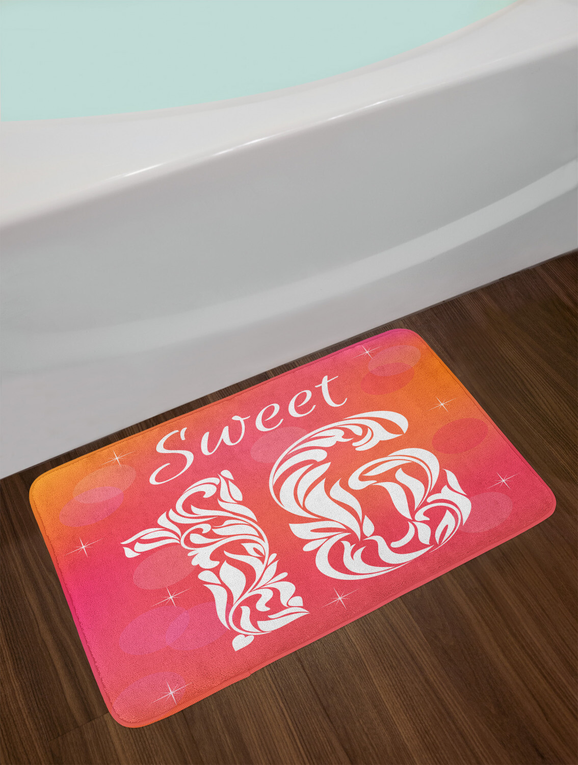 16th Birthday Bath Mat Bathroom Decor Plush Non-Slip Mat 29.5" X 17.5" Decorative bath mat with soft plush surface with anti - slip backing. Measurements: 29.5 INCHES WIDE X 17.5 INCHES LONG. This mat is very comfortable with it's soft plush surface. It has anti slip backing which is durable and long lasting. Backing will not harm your flooring. Water resistent and dries FAST. No shedding. Ideal accent item for anywhere you need a cozy step. Ideal for kitchen, bathroom, vanity, master bathroom, kids bathroom, guest suite, laundry room, spa, vacation home, hotel bathroom. These unique designs match well with various color palettes of towels, rugs, shower curtains and any other bathroom accessories. It’s a quick and luxurious way to refresh and completely change the appearance of a room without a big expense. Made from %100 polyester high quality and environmentally friendly materials. No chemicals used, No dye substance harming the health of you or your family. A perfect gift idea for your mom, dad, sister, brother, grandma, wife, husband and all other beloved ones with thousands of surprising designs. You can find a theme for everybody and every interest in our Ambesonne Collection. Colors won't fade thanks to new digital printing methods. Customized, personalized products are very popular. As manufacturers of digital printed home textiles, we follow current trends and bring you the latest home fashion. Either a gift to your family or friend, relative or boyfriend girlfriend, or to yourself, the item should be interesting and authentic. Men, women, kids, teens, boys or girls everybody will love this shower curtain. CARE INSTRUCTIONS: Machine wash on cold delicate cycle with mild detergent and water; DO NOT bleach. DO NOT place mat on a already wet surface. The digital images we display have the most accurate color possible, however due to differences in computer monitors, we cannot be responsible for variations in color between the actual product and your screen. Proudly designed & printed in the USA.