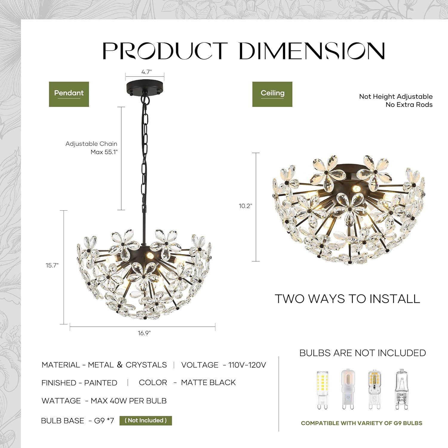 17" Modern Black Crystal Sputnik Chandelier for Dining Living Room Glam Luxury Petal Hemisphere Chandelier 7-Light for Foyer Hallway Elegant Pendant Ceiling Light Fixture for Kitchen 💕 【New Decoration - Crystal Sputnik Chandelier】- This chandelier adopts the appearance design of hemispherical lamp body + multiple satellite rods. Exquisite black paint sprayed on high-quality metal, matched with brand new petal crystal decoration. From a distance, it looks like a blooming crystal flower. Very gorgeous, elegant and modern design, making your house look amazing. 👍 【Small Size & 2 Installation Ways】 This crystal chandelier is Height 16.9"W x 15.7"H, Adjustable Chain Length: Max 55", you can adjust the height to match your room, and compatible with sloped ceiling. Also, this light fixture can be mounted on the ceiling like a ceiling light. Please ensure dimensions of this crystal chandelier light fixture is fit for your prepared space or not. 💡 【Bulb Requirement & Dimmable】This crystal pendant light need 7 x G9 bulbs (Max 40-watt Per Bulb, Bulb Not Included). Support LED, Halogen bulbs, etc. It is fully dimmable with a compatible dimmer switch and bulbs, to create the perfect lighting effect (Bulbs and dimmer switch both are not included). 🏠 【Ideal Indoor Decoration】- This Modern luxury style chandelier is perfect for wide application, kitchen island, living room, dining room, bedroom, enterway, hallway, foyer, corridor, stairway, bars, cafes, hotels, and restaurants, etc. 16.9" * 15.7" Semicircle Color Black, 7-Light Material Metal, Crystal Style Modern, Luxury, Glam, Elegant Light fixture form Chandelier
