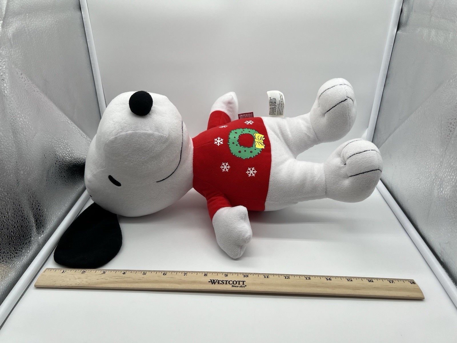 17" Snoopy Christmas Plush in White with Red Wreath Sweater Stuffed Animal