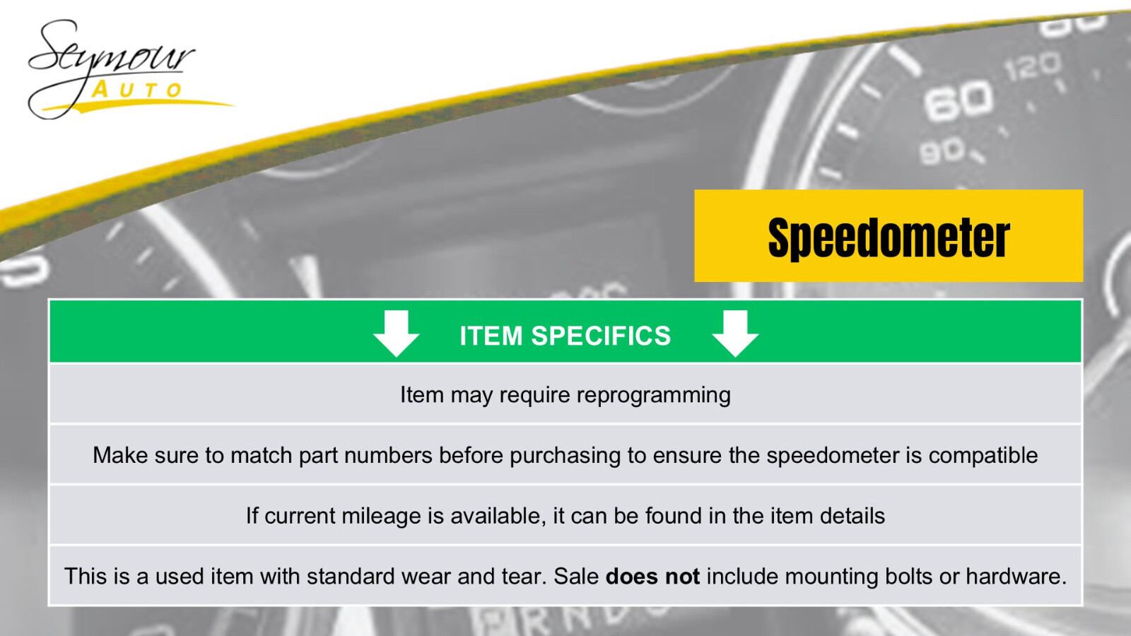 Hollander Welcome to our eBay store! Speedometer MPH US Market Multi-color Graphic Display Fits 17-18 CRUZE 719158 Description ******* SAME DAY SHIPPING ******** Donor Vehicle Model : CRUZE Year : 2017 Mileage : 89000 (0 = not available or unknown) Stock Number : 231130 Notes : This Part Will Fit These Makes And Models With These Options CRUZE 17 MPH (US market), gasoline, AT, ID 39072251 CRUZE 18 MPH (US market), gasoline, multi-color graphic display (opt UDD), w/automatic engine stop and start (opt KL9) About Us Payment Shipping Returns Warranty About Us We are a locally owned business with over 70 years of experience in the automotive industry with an extensive collection of used car parts and accessories for thousands of different vehicles. Our knowledgeable and caring staff work hard every day making sure all of our parts are high quality and functional to fit your needs. We are happy to verify fitment for you prior to purchase via your vehicle’s VIN (Vehicle Identification Number). Please contact us with any questions prior to purchasing. Orders are sent to the shipping department throughout the day therefore we cannot guarantee adjustments to orders after payment is received. Payment Payment details: Please contact us with any questions prior to purchasing. Orders are sent to the shipping department throughout the day therefore we cannot guarantee adjustments to orders after payment is received. All orders must be paid in full prior to shipment. Payments are processed through eBay by eBay. If payment is not received within a reasonable time from when the order is placed, it will be cancelled without notice. All purchase prices are final. No price match or discount can be made while an item is awaiting payment. Shipping Shipping Details: Items are shipped after being paid in full. We only ship to US addresses within the continental 48 states. Shipping to AK, HI and PO Box's require a special rate and are subject to additonal charges. All parts listed with Free Shipping have a one day handling time and may not be picked up by the carrier the same day the part is ordered. Any estimated delivery dates provided are only estimates and are not guaranteed to be accurate. We are not responsible for any delays with UPS, Fed-Ex or USPS. We must be contacted same day if an item is received damaged. All address changes must be completed before the part is shipped. Address changes that take place after the part has been shipped are subject to an address change fee. Overnight and expedited shipping options are available for an additional cost. All parts listed as, Pick Up Only , can be shipped if the shipping cost is covered by the buyer. All parts listed as, Pick Up Only , will be held at Seymour Auto Wrecking (107 New Haven Rd, Seymour CT 06483) for the buyer. International orders are shipped via eBay’s Global Shipping Program. We are not responsible for any shipping charge associated with eBay's Global Shipping Program. We are unable to change the delivery address on all orders shipped through eBay's Global Shipping Program. eBay must be contacted directly. We are not responsible for any delays or issues reagrding any item purchased and shipped through eBay's Global Shipping Program. Returns All parts sold have a standard 30-Day return window. Return Details: We must be contacted within 30 days of the carrier provided delivery date for the return to be accepted. No return wil be accepted if contacted after 30 days from the carrier provided delivery date. We may require more information reagrding a return request. ex: pictures, receipts, videos, etc. A free return label will not be provided for remorse return reasons. ex: changed mind, ordered by mistake/by accident, didn't like it The buyer must ship the return within 21 days of receiving a return label or starting a return. All returns must be sent in the appropriote sized box with adequate packaging. Any return received damaged may be eligible for a refund deduction. All returns made must be occompanied with a return reason. All returns that are received without a reason will not be processed. If a return label is issued by eBay, we are not responsible for reimbursing the buyer for the cost of the label. In the event the part returned does not match the original part sent, a case will be opened up with eBay. Warranty All parts come with our standard 6-month warranty. Please contact us for more details prior to ordering. The warranty begins as soon as the buyer takes possession of the part. Standard 6-Month Warranty: If a part is proven to be defective within the 6 month warranty period, a replacement or refund will be sent at our discretion. We are not responsible or liable for any incidental or consequential loss or damage. We will require more information reagrding a warranty request. ex: pictures, receipts, videos, etc. No warranty claims or reimbursement on labor. All body parts are sold as is. Any part that is damaged or altered by the buyer will not be eligible for warranty or return. No warranty claim can be made based on color or trim package. We are not responsible for the buyer's error. ex: Accidental orders, late address changes. We do not offer an extended warranty with eBay. If you experience any issue with your part, please contact us prior to attempting to repair or remove the part. Failure to do so will void the warranty. We make no claim as to the suitability of any part for any particular purpose. The buyer is responsible for determining the suitability of the part purchased for its intended purpose. In the event an incorrect part is shipped, please contact us immediatley so an exchange can be processed. Copyright © 2022, All Rights Reserved. Template Design & Developed By: Copyright © 2022, All rights reserved. Design & Developed By : eFusionWorld