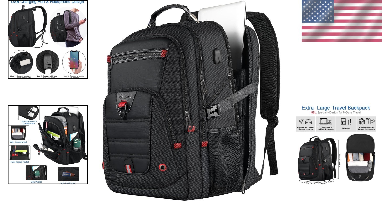 17.3 Inch Water-Resistant Travel Backpack with Ergonomic Design - 52L Space ‹ › ‹ › ‹ › ‹ › ‹ › ‹ › ‹ › ‹ › ‹ › 17.3 Inch Water-Resistant Travel Backpack ✔ 100% Lifetime Promise: Enjoy peace of mind with our travel backpack. Designed for innovation, sturdiness, and style, this 17.3 inch laptop backpack is the ultimate travel companion—perfect for both men and women on any adventure, near or far. Key Features: Large Capacity: Dimensions: 20.47" x 15.2" x 10.24" (52L). Featuring 3 spacious compartments including a dedicated 17.3" laptop sleeve and a main section for clothing and daily necessities. Front organizer equipped with multiple pockets (pen slots, mesh storage, key clip) and an anti-theft back pocket. Contains 18+ pockets, including 2 pockets for water bottles and side pockets for small items. TSA-Friendly Design: Speed through airport security with the lay-flat, TSA-compliant design. Unfolds 90–180° for quick screening. Luggage strap allows you to attach the backpack to your suitcase, making it ideal for travel, hiking, business trips, and weekend getaways. Stay Connected: Equipped with an external USB port (built-in cable; power bank NOT included) for your devices. Features a sturdy top handle and a headphone hole for easy access. Ergonomic & Comfortable: Padded shoulder straps and a ventilated back panel reduce sweat and strain for all-day wear. Breathable and adjustable shoulder straps distribute weight evenly, making it ideal for long trips. Why Choose This Travel Backpack? This large capacity travel backpack is not just a bag; it’s designed for comfort and convenience while you explore the world. Whether for work, school, or leisure travel, this multifunctional backpack meets all your needs. A perfect gift for professionals, travelers, and adventurers seeking style and functionality. Accompany you on any trip with confidence! Shipping Free & Fast Shipping - We offer free shipping to most of the USA with a normal delivery time of 3-10 businessdays. However, due to various situations, additional delivery time (up to 3 weeks) may be required for some items. Alternative Carriers - We may use alternative carriers (e.g. USPS, FedEx, UPS, etc.) to ensure your package arrives safely and on time. Due to the use of multiple carriers, we are unable to provide a tracking number automatically. Handling Time - Orders are processed and shipped within 1-5 business days of receiving cleared payment. Shipping Restrictions - Shipping to Alaska, Hawaii, Puerto Rico, Guam, and other US territories may incur shipping charges or delivery restrictions. Please contact us before ordering, or your order can be refunded/cancelled. State Restrictions - There may be restrictions based on your state of purchase. For example, certain items may not be shipped to California due to state regulations. Contact for Tracking Updates - If you require tracking updates or have any concerns about the delivery of your order, please feel free to contact us, and we will be happy to assist you. Return Please see our ebay return policy. We do not accept return on most products. This is to avoid customers mis-using ebay returns. All sales are final. Please be sure to check the return policy listed at the top of the listing. In rare cases, we may accept returns, if the buyer pays both ways shipping and 20% restocking fee. If you are un-sure of return policy of a particular item, please ask before buying. Payment We accept all major credit cards, PayPal, and Apple Pay for your convenience. Your payment information is secure and encrypted to ensure a safe and seamless transaction. Please complete your payment within 3 days of purchase to avoid any delays in shipping. Feedback Your feedback is extremely important to us. We strive to provide the best products and customer service possible. If you are satisfied with your purchase, please take a moment to leave us a positive review. If you have any concerns or issues with your order, please contact us before leaving negative feedback. We are committed to resolving any problems and ensuring your satisfaction. Contact Us If you have any questions or concerns, please feel free to reach out to our customer support team. You can contact us through the eBay messaging system. We are available Monday to Friday, 9:00 am to 5:00 pm EST, and we will do our best to respond to your inquiry within 24 hours. Buy it now and enjoy a pleasant shopping experience! UPC: Not Set Strap Drop: Not specified Unit Quantity: 2.2 pounds Material: Polyester Theme: Designer Lining Material: Not specified Features: Anti-Theft,Water Resistant,USB Charging Port,Ergonomic,Comfortable Handle/Strap Material: Not specified Character: Not Set Closure: Zip Customized: No Occasion: Business,Casual,Travel,Workwear Brand: Unbranded Style: Backpack Department: Travel Backpack Color: Black Size: Extra Large Pattern: Not Set Bag Width: Not Set Bag Height: Not Set Bag Depth: 10.24 in Product Line: Not Set Fabric Type: Not specified Country/Region of Manufacture: Not Set Hardware Material: Not specified Handle Style: Not specified Model: Not Set Year Manufactured: Not Set MPN: Not Set Unit Type: lb Vintage: Not Set Handmade: Not Set Personalize: Not Set