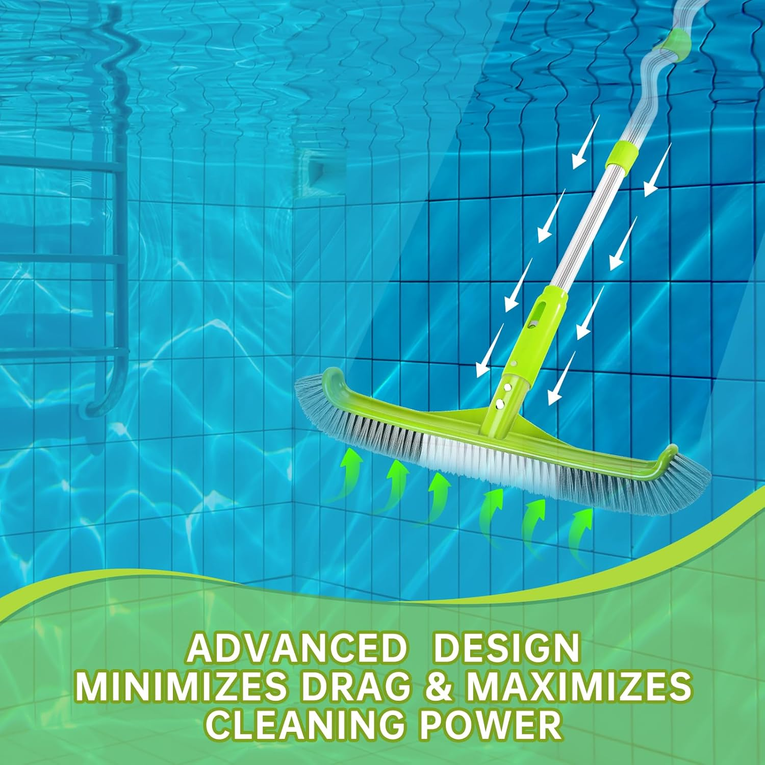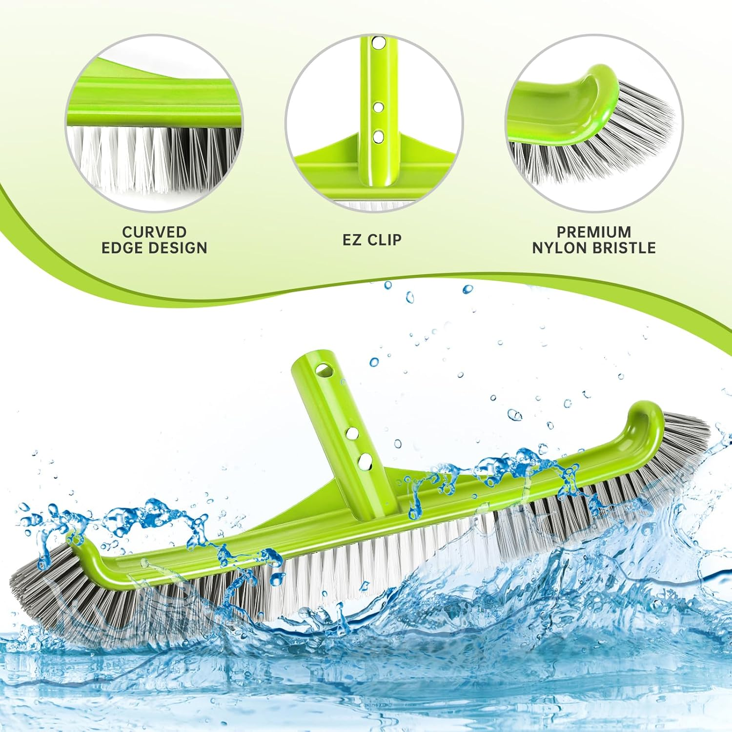 💦【2024 Newest Deluxe Design Upgrade】💦High-end and Elegant appearance & Premium Texture ,Fine process makes it show a sense of modernity and more beautiful. Compared with the most pool brush, will give you a perfect and incredible experience. 💦【Impact Resistant Plastics And Durable Nylon Bristles】💦Reinforced brush structure is made of premium quality plastic (enhanced & rust-proof), which makes the pool scrub brush stronger.Compare with other pool brush bristles,This Bristles are close integration with brush back ,longevity and durability, difficult to fall out. high-density poly bristles to help reach the toughest corners,Reinforced backing provides enough strength to thoroughly clean pool walls and tiles. 💦【Wide Sweep Area & Efficient】💦The Bush handle is angled at 45°for easy pushing and effective cleaning, help you save more energy. Measuring 17.5" wide, the Deluxe Wall Brush provides a large sweep area for quicker cleaning. Designed with curved edges and high-density poly bristles to help reach the toughest corners,metal backing provides enough strength to thoroughly clean pool walls and tiles. 💦【Safe for Pool Liner】💦The smooth and round finishing edges as well as the premium nylon bristles of the pool brush are gentle on pool liners and painted pool floors, so there are no scrapes or snags to pool surfaces,even to vinyl pool liner. 💦【Easy To Use & Multi-scene use】💦It is compatible with most 1-1/4" standard pool poles,with EZ Clips simply connect to telepole or extension pole and get brushing right away.Perfect choice for cleaning wall and tile of pool ,home & hotel, it also suitable for scrubing bathroom floor,raking leaves off roofs. Pool Brush,17.5" Curved Edge Pool Brushes Head for Cleans Pool Swimming Walls, Tiles & Floors, Premium Nylon Bristles with EZ Clips