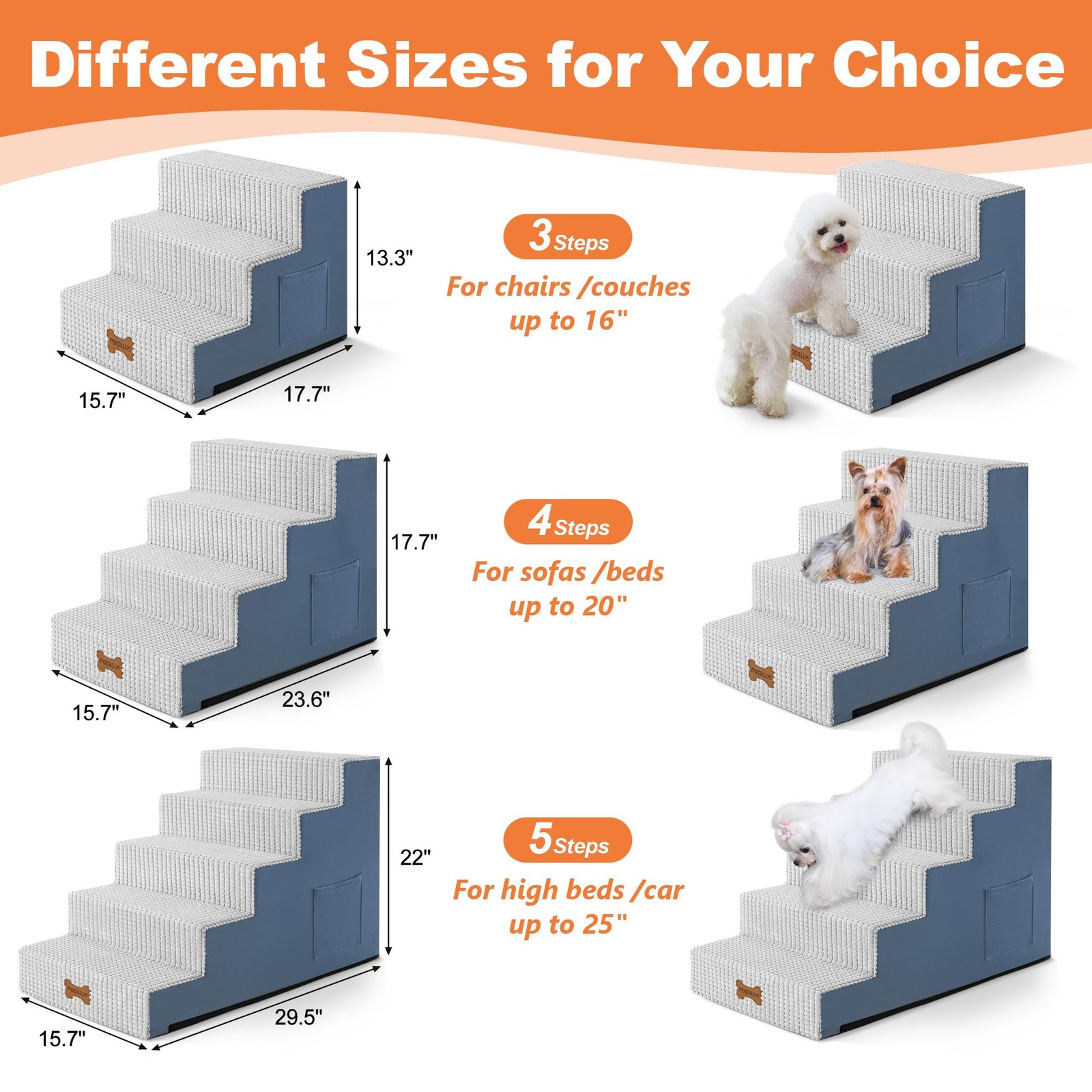 foam dog stair is designed to securely fits snugly against beds, sofas, and various furniture edges, providing your pet safe and easy access up and down. It's a portable dog step suitable for small and medium dogs. MULTI-SCENARIO USE - foam dog stair is designed to securely fits snugly against beds, sofas, and various furniture edges, providing your pet safe and easy access up and down. It's a portable dog step suitable for small and medium dogs. DIFFERENT SIZE TO CHOOSE: The dog steps are available in 3-step, 4-step, and 5-step configurations to accommodate pets of all sizes and furniture heights (couches, high beds, cars). The stairs also feature side pockets for storing your pet's small items. Plus, a pet hair removal roller is included, making it easy to keep both the stairs and your clothes free from pet hair. SAFE AND STABLE: Made from high-quality sponge material, this dog ramp offers a weight capacity of up to 50 lbs, providing reliable support for your dog's paws as they climb up and down to the sofa or bed. The soft, supportive surface ensures stability with every step. Meanwhile, the lightweight design makes it easy to carry, so your pet can enjoy the ramp both indoors and outdoors in various settings. FIRM AND NON-SLIP: These dog stairs are covered in soft coral velvet fabric with a 3D textured surface, providing extra grip for your dog's paws to prevent slipping as they climb. The bottom features a non-slip point design that keeps the stairs securely in place, ensuring stability during use. This combination of materials offers both comfort and safety, allowing your dog to climb the stairs easily and confidently without worrying about displacement. EASY TO INSTALL AND CLEAN: dog steps feature a removable, machine-washable coral fleece fabric cover with a waterproof backing to protect the sponge from water damage. For added convenience, the stairs are vacuum-sealed for compact packaging. Simply unpack, let the sponge fully expand within 48 hours, and your stairs will be ready for use—no assembly required!
