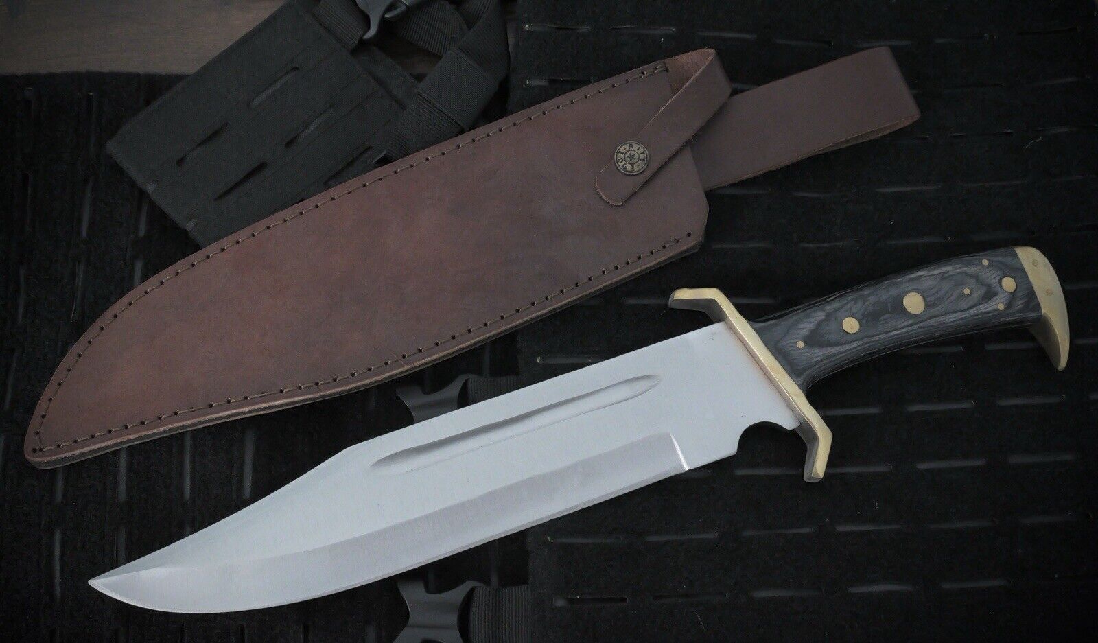 This 17" Bowie Knife with a full tang and brass guard is a heavy-duty tool perfect for any outdoor adventure. The knife features a drop point blade made of high carbon stainless steel with a plain edge and a silver color. The blade is 13 inches long and the knife is designed for ambidextrous dexterity. The knife comes with a sheath and is manufactured in India by Tattva Tactical. It is an original piece and not a reproduction. The knife is perfect for collectors, knife enthusiasts, and anyone who needs a reliable and durable knife. With its huge size and heavy-duty construction, this knife is sure to meet all your outdoor needs. Item ships express from USA