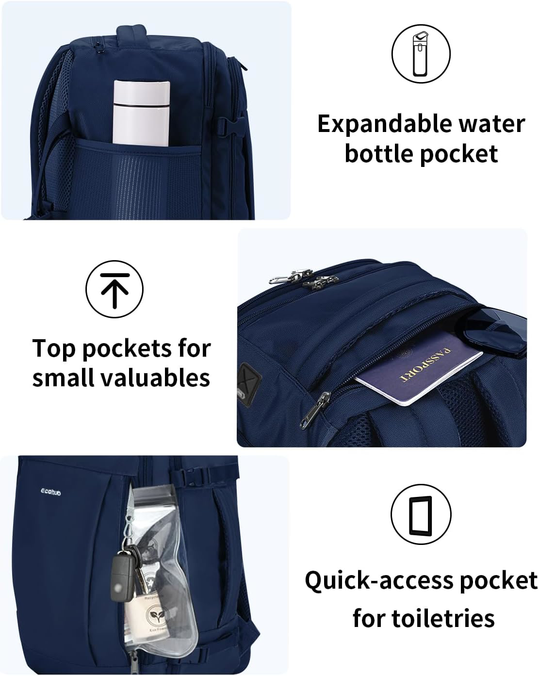 Fast Shipping Great Customer Support Satisfaction Guaranteed DESCRIPTION Shipping Shipping Shipping All domestic packages are shipped for Free (Unless other shipping method was selected during the checkout) Most items ship and arrive much sooner than the estimate delivery date. Usually within 2-3 days from payment. However, we have longer estimates to compensate for the occasional delay or supply chain breakdown. We do not accept P.O. BOXES - PLEASE PROVIDE A PHYSICAL ADDRESS Return Return Return In the event that you would like to return your purchase, we allow returns that are processed within the defined return date (the return date is to be found in the return policy/shipping and handling section) Please contact us for a return authorization and the return shipping address. Payment Payment Payment PayPal is our preferred method of payments it's the quickest, easiest and most secure way to pay for your goods or services online. PayPal offers buyer and seller protection should there be a problem. If you do not have a PayPal account, to get started and buy your first item with us is very easy. Simply click on the 'Buy It Now' button and follow the eBay checkout steps. Select PayPal as the payment method you then will be given the chance to enter your card details in to PayPal's secure checkout in order to pay for your order. Once the payment has been made, you will then be given the opportunity to make your own PayPal account to make paying for your items in the future very easy. Should there be a problem with payment please do let us know. Feedback Feedback Feedback Customer satisfaction is very important to us. If you have any problem with your order,please contact us and we will do our best to make you satisfied, please do not leave a negative feedback before we resolve your problem. We guarantee that your issue will be solved quickly. As long as you are happy with your purchase of , please leave us a positive feedback. Your feedback is very important to us it affects our search placement on eBay. We will leave a positive feedback for you in return automatically once we receive your feedback. Contact Us Contact Us Contact Us If you have any queries, please contact us via ebay. We usually respond within 24 hours on weekdays. Thank you for visiting our ebay store! 【AVOIDING BAGGAGE CHARGES ON FLIGHT】: ECOHUB Airplane travel backpack have the perfectly sized to avoid baggage fees. The underseat carry on bag measures 17x11x8 inch and has a capacity of 25L, with a weight of 1.5lb. Suitable for all major airlines like spirit, frontier, easyjet.(PATENT PENDING) 【LARGE CAPACITY】: The carry on Backpack opened up like a suitcase which makes it way easier to pack. The spacious main compartment with two thoughtfully-designed pockets that help your contents more organized and elastic straps are perfect for bulky items like shoes and clothes. Side compression straps adjust the travel bag space so you can pack more. 【MULTIPLE COMPARTMENTS & POCKETS】: Large front organizational pockets can hold important items such as ipad and notebooks, pens, passports. The key chain can secure and locate your keys stress-free. A top access pocket so you can grab your travel documents and glasses quickly. The hidden back pocket can hold valuable items such as phone, wallet and so on. Quick access zipper pocket on front panel for toiletry bag security check. 【READY TO TRAVEL】: Built with a USB charging port, the smart backpack will keep your phone fully powered when you travel. Perfect for both short trips and long journeys, the thick and soft shoulder straps with foam padding. The expandable water bottle pocket is very convenient for travelers and hikers. The side handle allows us to easily carry it as a holdall. Looping the luggage strap for easy to move with your suitcase. 【SUSTAINABLE & GUARANTEE】: Our Carry on backpack is made from at least 50% recycled materials, with fabric and lining crafted from 30 recycled PET plastic bottles. The water-resistant, lightweight fabric, combined with heavy-duty SBS zippers and reinforced ripstop stitching, ensure durability for any adventure. If you have any concerns, reach out through your order. (Patent Pending) 17 Travel Backpack with USB Port & 13 Pockets, Water Resistant, Blue Click here to see description Fast Shipping Great Customer Support Satisfaction Guaranteed DESCRIPTION Shipping All domestic packages are shipped for Free (Unless other shipping method was selected during the checkout) We ship within two business days of payment, usually sooner Standard FREE shipping takes between 3-5 business days Expedited shipping takes between 2-3 business days Overnight shipping takes between 1-2 business days We do not accept P.O. BOXES - PLEASE PROVIDE A PHYSICAL ADDRESS We Ship Globally using ebay's GSP, the item is sent to a logistic center in KY and shipped from there to the rest of the world. International customers are responsible for all duties and taxes Contact your local authority for questions related to the amount of duties or taxes you will be responsible for Return In the event that you would like to return your purchase, we allow returns that are processed within the defined return date (the return date is to be found in the return policy/shipping and handling section) Please contact us for a return authorization and the return shipping address. Please contact us for a Return Merchandise Authorization (RMA) number. We advise you to use a reputable carrier service when returning your goods. Please pack all returns appropriately. We ship globally Via eBay's global shipping program (GSP). Thus we don't cover returns for items shipped globally. Buyers returning such items will be refunded ONLY for the item's cost and not for the shipping. please check the Voltage information and make sure it matches the one in your country. In case it's not stated in the description, do ask us. Payment PayPal is our preferred method of payments it's the quickest,