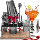 Mixology Bartender Kit: Create your favorite drinks with a cocktail kit gift set. Our Bar Set Cocktail Shaker Set Bartending Kit includes the bar tools and barware you need in a home bar kit. Complete Cocktail Set: Cocktail mixer set includes: wooden stand, 2-piece Boston cocktail shaker, 30 oz; double sided jigger, mixing spoon, Hawthorne strainer, 6 liquor pourers, 7" flat bottle opener, citrus juicer, 2 stainless steel 3 oz shot glasses, and recipe booklet. Compact Barware Set: This cocktail shaker set bartender kit is compact and portable. Place the bar tool set inside the cocktail shaker for elegant storage. Professional Bartender Set: Our shaker set, bartender kit is made from commercial-grade stainless steel. Rustproof and dishwasher safe, this drink mixing set is built to last. cocktail shaker bartender kit set bar accessories tools mixology for the home drink shakers mixer with strainer tool mixing martini boxton bottle opener muddler for cocktails liquor bottle pourers cocktail recipe book lemon juicer squeezer jigger bartending spoon shot glasses silver