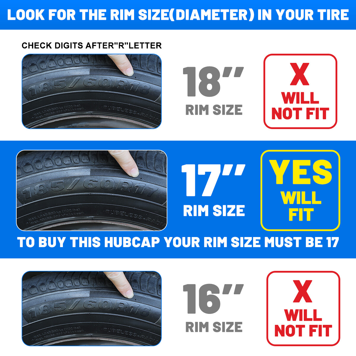 Specification: Fits either LH (Driver Side) or RH (Passenger Side) Rear and Front Type: Wheel Hub Caps Color: Silver Compatible Wheel Diameter: 17 inches Features:Car Wash Safe, Easy to Install, No Tools Required Material: ABS Number in Pack: 4 Wheel Type: Steel Placement on Vehicle: Front, Left, Rear, Right Installation Type: Snap-On Description: 100% Brand new in box. Unused, unopened, undamaged item in its original packaging Rust proof and corrosion resistant ABS Plastic Easy push on installation with no need for tools Stainless Steel retention ring for durability and maximum grip Designed with a tire steam cut out on the hubcap and retention ring Premium designs and triple coat color paint hubcaps Come in a complete set of 4 caps and 4 retention rings About this item: ✔️Please Ensure to Check your Tire/Wheel Size Before Purchase! ✔️Designed for (P15) 17” Wheels and will not fit over aluminum alloy wheels. ✔️ Easy to Install - Mount our car hub caps onto your wheels in just 10 minutes! ✔️ Customize Your Ride - No need for a total overhaul to enhance your car's look! Conveniently replace run-down, aging or rusty car hubcaps with a stunning rim cover. ✔️Designed from OEM Replica Style Wheels– For Replacement with Fast & Easy Snap-on Installation - Made from Premium ABS Material – Lab & Road Tested for Performance and Ultimate Durability. ✔️Adjustable Retention Rings assures Firm Grip Gives Support to the Hubcaps Making Sure They Stay in Place. Locate the Curve on the Retention Ring and Match to the Tire Air Valve to Install.