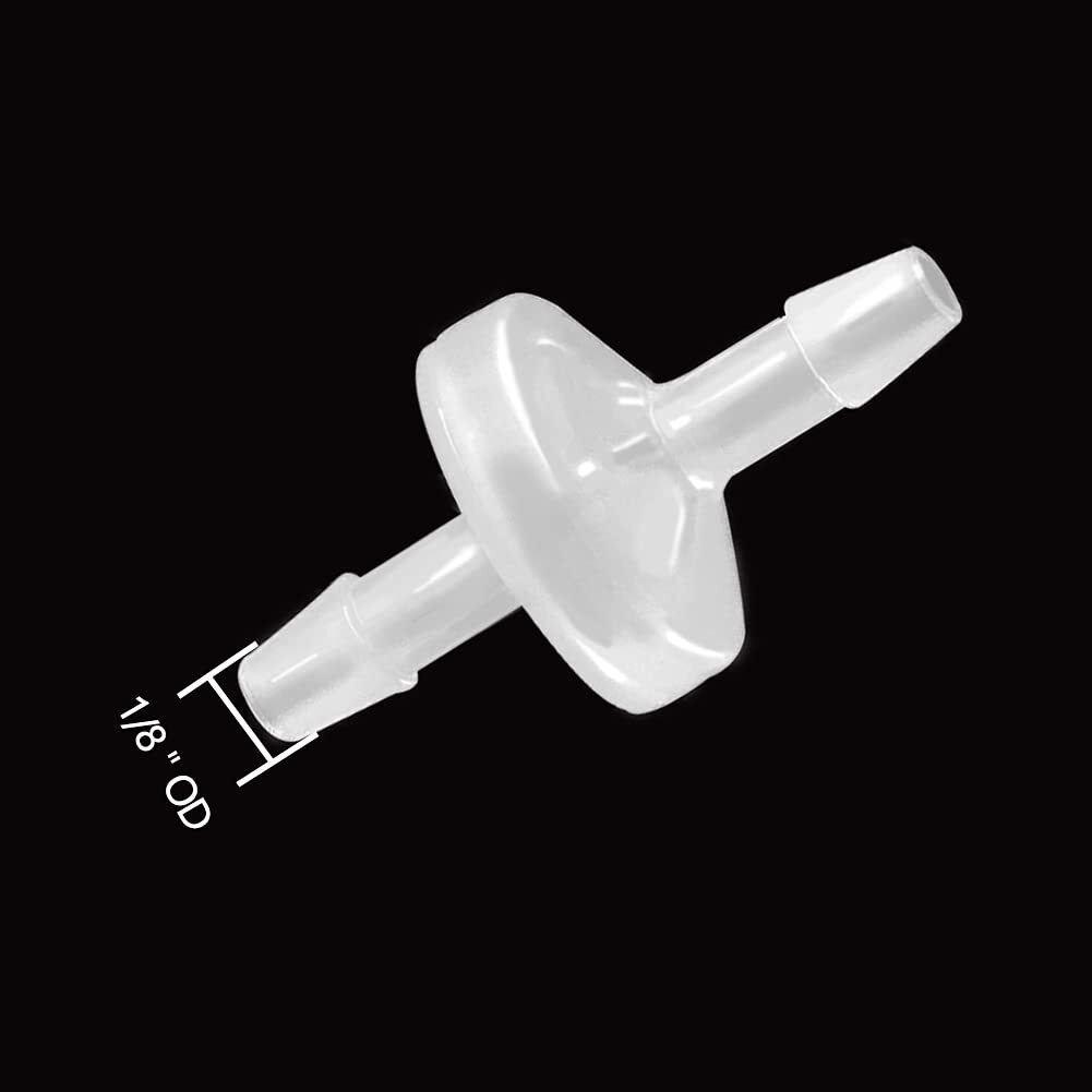 【Material】 Plastic barb connector, made of high-quality PVED material 【Size】 1/8" OD One Way Check Valve,Can fit 1/8" hose ID 【Function】The check valves are applicable for fluid systems to prevent countercurrent liquids, or for pneumatic systems to prevent reverse flow of compressed air. 【Performance】Hose barb check valve’s Opening pressure: 0.5 Kpa, Maximum back pressure: 300Kpa. Normal performance under 25 ℃ to 60 ℃,Strong resistance to acid, alkali, salt corrosion ability 【Design】The check valve is designed with a non-slip card slot inside, which has strong adsorption performance, prevents falling off, non-toxic, and has air tightness.