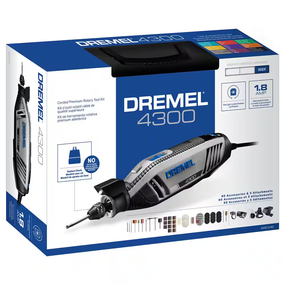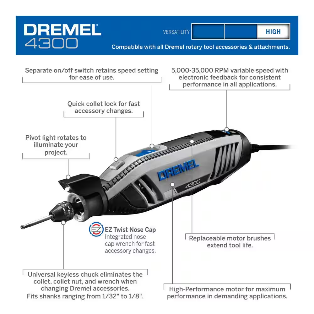 Fast Shipping On All Items 30 Days Money Guarantee Customer Support Excellent Service 100% Satisfaction Satisfaction Guaranteed 4300 Series 1.8 Amp Variable Speed Corded Rotary Tool Kit with 11-Pc EZ Lock Cutting Rotary Accessories Kit Specification Amperage (A) 1.8 A Chuck Capacity (in) 1/32 in Chuck Type Keyless Condition New Cord Length (ft) 6 ft Corded Tool Type Rotary Tool Cordless/Corded Corded Kit Yes Maximum Speed (RPM) 35000 RPM Power Tool Features Keyless Chuck,Variable Speed Product Weight (lb) 4.95 lb Returnable 90-Day Tools Product Type Power Tool Variable Speed Yes Certifications and Listings CSA Certified Manufacturer Warranty Two-year warranty Product Depth (in) 15.25 in Product Height (in) 10.5 in Product Width (in) 3.75 in 3.75 inches x 15.25 inches x 10.5 inches. Weight: 4.95 lb Item Description Ideal for cutting, sanding, grinding, drilling, carving and more Dremel's most powerful 1.8 Amp motor for maximum performance Specially curated kit of 11 EZ Lock cutting accessories The Dremel 4300 is the first Dremel rotary tool to allow tool-less and collet-less accessory changes with the inclusion of the 3-jaw chuck. The chuck accepts all Dremel accessory shank sizes for fast and convenient accessory changes without ever using a wrench. Featuring the all new Pivot Light, your projects are well-lit with an optimum line of sight since the light pivots to direct illumination where you want it. Experiencing the full range of Dremel rotary tool applications is easier than ever because the 4300 offers our most powerful motor with built-in variable speed and electronic feedback circuitry. And the slim, ergonomic body design provides a comfortable 360° grip zone no matter how you hold it for extended ease of use. The completely redesigned airflow system lets the Dremel 4300 run cool, quiet and smooth so completing projects are more enjoyable than ever. This 11-piece EZ Lock cutting accessory kit is specially curated to perform all cutting application, ideal for cutting in either metal or plastics. The kit provides the organized storage of popular Dremel accessories in a small, compact footprint. This accessory set offers a reusable storage case with clear lid and lift-out tray for easy organization of the included bits. The kit consists of EZ Lock thin cut wheels, EZ Lock metal cut-off wheels, EZ Lock plastic cut-off wheels, and EZ Lock mandrel. EZ Lock technology allows for quick accessory changes without the need for a screw or wrench. About us We offer the best prices around on high quality products. Our E-store includes media such as books, movies, music and games while offering electronics, toys, sporting apparel, clothing, tools, general home, garden items and more. Shipping We are always working hard to ensure your package arrives as soon as possible. Please understand that some factors like weather, high postal traffic, and the performance of shipping companies are outside of our control. We offer free shipping to the lower 48 states and ship within 2-3 business days of payment, usually sooner. We do not accept P.O. Boxes. Please provide a physical address. For shipping outside of the continental USA, we only use eBay's Global Shipping Program.The item is shipped to KY and then sent to the rest of the world. International customers are responsible for all duties and taxes. Continue to check out to calculate costs for shipping the item to your country. Messages regarding eBay's Global Shipping Program MUST be directed at eBay EXCLUSIVELY. Returns We offer a 30-Day Return Policy on items in which you are not completely satisfied with. You have the option of a full-refund or an exchange of the item. No returns are available on items shipped outside of the USA Satisfaction We try over very best to make sure every customer is completely satisfied. If there's a problem, message us! We're happy to help. Payment Options Shop With Confidence