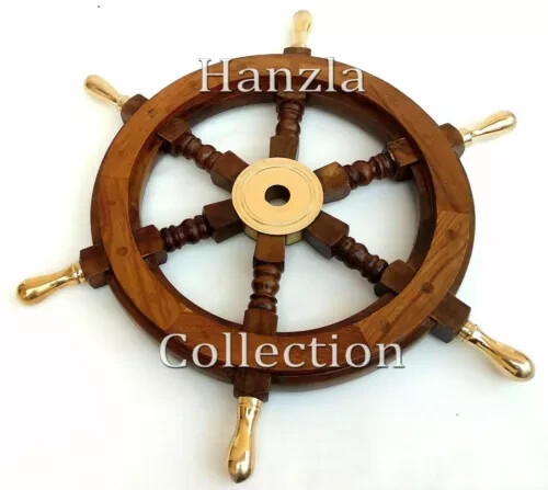 Material : Wood & Brass Finish : Brown Polish & Shiny Brass Weight : 1.950 Kg Approx Measures 18 inch Diameter End to End Diameter outer Ring :12.7 inch, 32.3 cm Brass Hub Diameter : 3 inch,7.62 cm Inner Shaft Hole : 0.79 inch, 2 cm Size : 18 x 18 x 1.7 inch, 45.72 x 45.72 x 4.3 cm approx Color : As shown in image Six Wooden Spoke Fitted in Center Brass Ring NOTE: This wooden ship wheel is for decor purposes only and is not indented for use on a seafaring vessel. "DUTY/TAXES ARE FREE SERVIES FOR U.S BUYER ONLY"