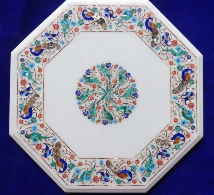 Welcome To Stone-Craft-Creations Shop Description Very unique Art by Indian Artist ,Coffee/Side Table top Used Material: Marble & Multi Semi Precious Gemstones Inlaid Size: 18"x18" inch Color: White Shape: Octagon Pattern: Handmade Room: Bedroom, Dining Room, Hallway, Home Office/Study, Kid’s Bedroom, Kitchen, Laundry/Utility Room, Living Room,Patio, Playroom Packaging: Wood & Foam Export Packing Shipping: Air Can be customize ,Please message your desired size Process of Making Marble Inlay 1. We are inlaying semiprecious stones in three different colors of marble White Marble,Black Marble & green marble. 2. The Marble used to inlay the semiprecious stone comes from city of Makrana, Rajasthan India. 3. First we cut the marble in different shape example Round,Octagonal,rectangle,oval & square shape. 4. After cutting the marble we paint the surface of marble with Hina(red Color) so we can sketch the geometry on the surface of Marble. 5. With the Help Of emery wheel we cut,polish & shape the semiprecious in different forms of flowers,buds,leafs & stems all the cutting of the semiprecious stones are manually cut by the artisans. 6. After cutting the semiprecious stones we assemble them to complete the motif & then the semiprecious stones are placed on the surface of marble so we can trace them on the surface of marble to make the exact size of the cavities once the stones are traced we remove the stones from the surface of marble & then manually we chisels the marble with the diamond chisels & tungsten carbide chisels once the cavities are completed we place the semiprecious stone in the cavities to check the depth of the stones. 7. When we are fully sure that the stone fits well in the cavities we use special kind glue to fix the semiprecious stones into the marble. 8. After completing the inlays into the marble we first rub the surface of marble with sandstone & then we polish the surface of marble with sandpaper which brings the natural shine on the surface of marble & to the semiprecious stone & we use wax polish to make the surface shiny. 9. Most interesting expect of this pietre dure( marble inlay with hard stone) all the designs are made by the artisans are purely an imagination of artist once made they cannot make another one exactly the same it will look similar but will not be the same. 10. This beautiful art is a dying art of Agra,India the artisans those make this beautiful art are the descendants of those families who built the Tajmahal in 17 century Tajmahal is a monument of love & you can easily see the artwork done with the same technique on the walls of the Tajmahal. 11. I Invite you to come to Agra,India & visit the beautiful Tajmahal & you will surely be impressed & we request you give us a chance to show you the true handmade art of Agra by our artisans. 12. When you are purchasing this beautiful handmade Marble inlay art you will always be happy because all the pcs made by our artisans with love,hope & happiness. 13. You will always be enjoying the beautiful handmade marble inlay artwork secondly you will be supporting the local artisans of Agra,India to keep this beautiful dying art Alive. 14. All the purchase benefits the artisans & the buyer as there is no middle men in selling & buying. Inspiration/Story Behind This Product 1. This beautiful inlay art is a dying art of Agra,India the artisans those make this beautiful art are the descendants of those families who built the Tajmahal in 17 century Tajmahal is a monument of love & and one of the seven wonders in the world you can easily see the artwork done with the same technique on the walls of the Tajmahal. Note 1.The marble inlay table is made in Agra, India. 2.The marble inlay table will be delivered by FedEx or DHL free of cost door to door. 3.If there is any local tax,custom duties or Vat will be paid by the buyer at the destination. 4.The parcel is dispatch with proper packing & fully insured covering all kind of risk. 5.This marble table illuminates if the light arrangement is made under the plate. 6.It is an art piece which will be a beauty & the conversation pieces at home. 7.If You Are Looking Something Customize, Let Us Know We Will Make For You As Per Your Design, Size & Shape. 8. This is only Table Top & Base/Leg is not included. If you want stand/leg also, please contact us For Wholesale or corporate Inquiry please contact us. Thank you very much for admiring beautiful handmade marble inlay art. Please recommend your friends & family members to visit our ebay store this art is Dying art of Agra & we need your participation to keep this dying art alive. Thanking you in anticipation for your great support. If you are in Agra please email us we love to show you the process of marble inlay work at our premises