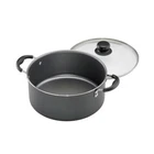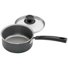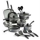 PrimaWare 18-Piece Nonstick Cookware Set provides all the cookware essentials and is an excellent starter cookware set. The patterned interior nonstick coating ensures easy cooking and simple cleanup, while the heat- and shatter-resistant tempered glass lids allow quick monitoring of cooking progress. PrimaWare 18-Piece Nonstick Cookware Set: Patterned gray interior non-stick coating for easy cooking and cleaning Riveted, stay-cool handles Heat- and shatter-resistant tempered glass lids allow easy monitoring of cooking progress Dishwasher-safe Compatible with gas, electric and ceramic glass cooktops Set includes: 8" saute pan 9" deep saute pan 11" griddle 1 qt sauce pan with lid 2 qt sauce pan with lid 3 qt sauce pan with lid 4 qt Dutch oven with lid (4 qt lid fits the 9" deep saute pan) Stainless steel foldup steamer Solid spoon Slotted spoon Solid turner Slotted turner Pasta spoon Ladle