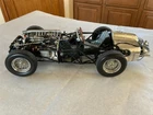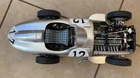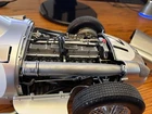 1:8 scale Mercedes W196, heavily modified from original Agora model kit. Body panels with added decals were clear coated, with a perfect gloss. The air intake scoop was made custom, and the engine is detailed with extra plumbing. This is a model to display in the open, with panels that can be removed for show. The majority of this model is metal.