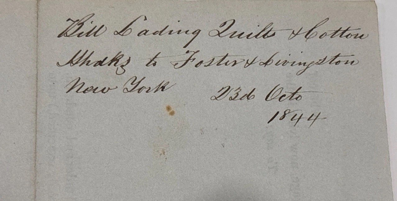 Original handwritten 1844 bill of lading for the schooner Excel, documenting coastal trade from Boston to New York during the pre-Civil War era. Signed by Master F. J. Lovell and shipped by Wm. H. Goddard to Foster & Livingston, known New York merchants of the period. The document records 14 cases of merchandise and one package of samples, with the reverse identifying the goods as quilts and cotton — a wonderful snapshot of early American commercial shipping. Original shipping marks appear in the margin and would have matched the crates for port identification. A scarce survivor of 19th-century maritime commerce and a desirable piece for collectors of nautical history, early American documents, or mercantile material. Good antique condition with expected age toning. Please review photos carefully for condition and detail. Date: October 23, 1844 Ship: Schooner Excel Route: Boston to New York Cargo: Quilts & cotton goods ⸻ ✨ Thank you for taking a look! If you think this could be your next purchase, don’t hesitate to make an offer — I truly enjoy connecting special treasures with the people meant to have them. ✨ Your item will be carefully packaged to ensure it arrives safely. Buy with confidence — I’m proud to maintain 100% positive feedback!