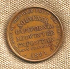 This very attractive medal, catalogued as so-called dollar HK-245a, is a souvenir of the 1894 California Midwinter Exposition, an official world's fair held in Golden Gate Park in San Francisco, California. The entire design is very high-relief (three-dimensional). The obverse design is based upon the California State Seal, and the reverse has the words THE LAND OF SUNSHINE FRUIT AND FLOWERS SOUVENIR CALIFORNIA MIDWINTER EXPOSTION 1894 . The composition is brass, and t he diameter is approximately 34 mm (1-3/8"). [6624Z] This medal is in extremely fine condition, with very light actual wear, with toning and some soiling. The medal remains bright, with a very good toned brass color. The illustrations in this listing are photos of the actual item being offered for sale, serving as part of the description. NOTE: The actual medal has more detail, has a better toned brass color, is brighter, and is more attractive than in the photos. Also, the spots in the photos are not nearly as apparent on the actual medal. This is a very nice example of this attractive medal! Payment must be received within ten days of close of auction. Shipping (First Class Mail with Tracking and Delivery Confirmation), $5.00 in the U. S. Combined shipping on multiple purchases is available. Shipments usually are made within one or two business days of receipt of payment - and always are made within three to four business days of receipt of payment. Please check out my other items ! THANKS FOR LOOKING!!!