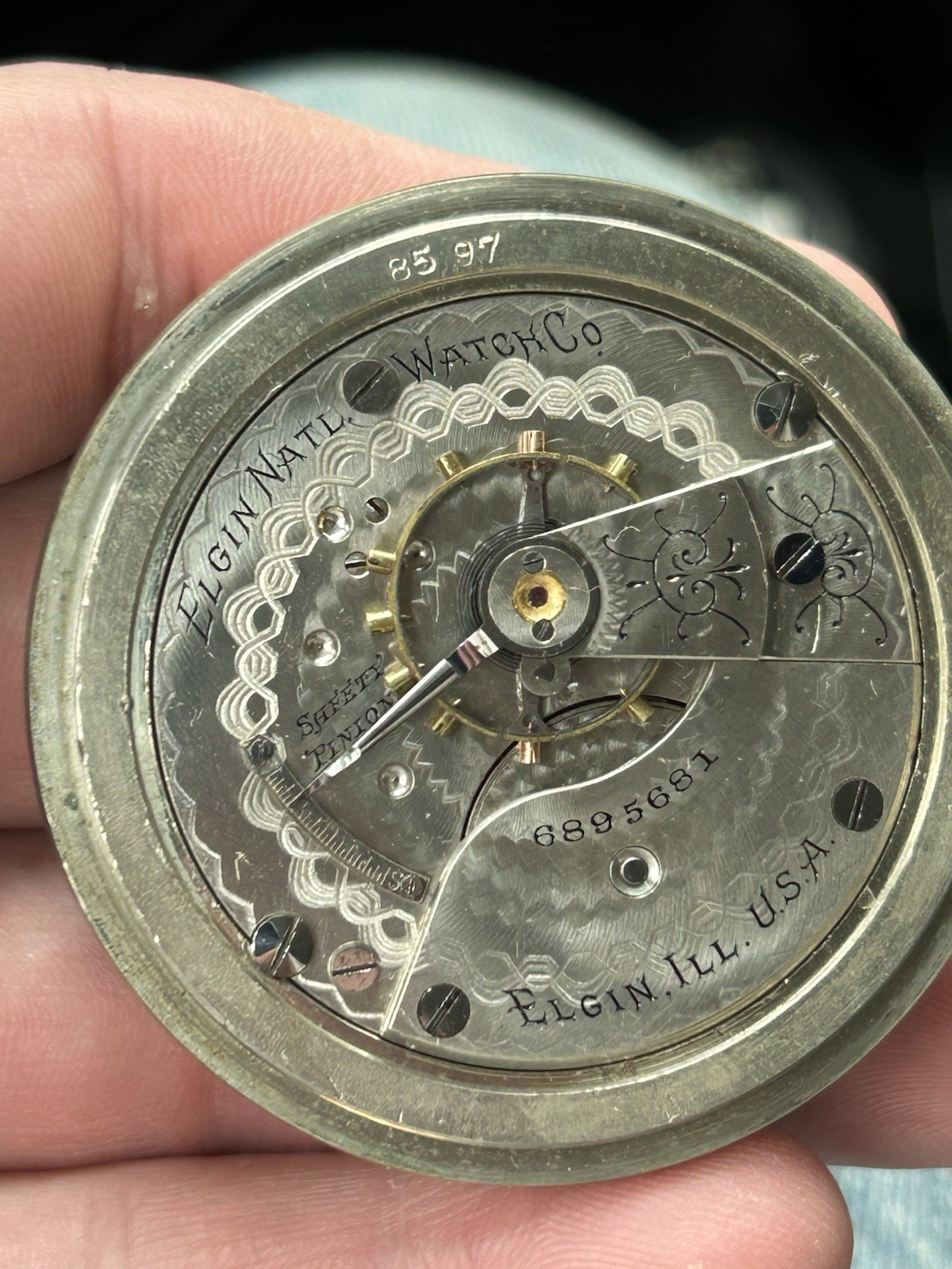 The 1897 Elgin Pocket Watch is a vintage timepiece with a mechanical (manual) movement and 7 jewels. It features Roman numerals on the dial, a 12-hour display, and is part of the Elgin brand, known for quality craftsmanship. Made in the United States during the late 19th century, this pocket watch does not come with original box or papers, but its silver case color adds to its elegant design. Perfect for collectors or those interested in unique and historical timepieces, this pocket watch exudes a classic charm and functionality that is sure to impress. It does have a slight damage to the dial face and normal wear and tear marks due to the age. The watch winds and functions as it should