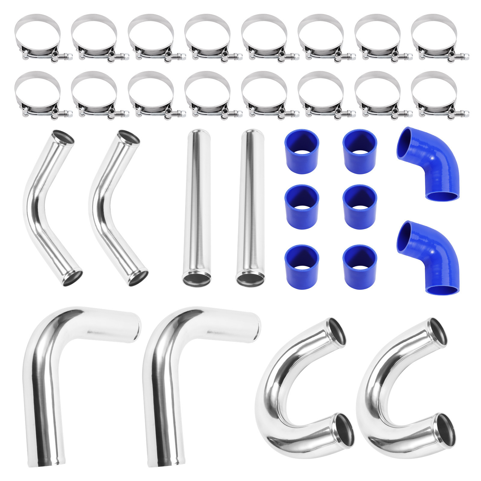 Description: Pipe Thickness: 1.8mm--Durable quality size Pipe length: 18'' Application:Universal fits all Turbo Projects Made out of high quality of 6061 aluminum Manual polishing finished,and the bolt clip is easy to install Specification: Condition: New Type: Turbo Intercooler Pipe Fitment Type: Direct Replacement Material: 6061 Aluminum Manufacturer Warranty:2 Year Features: Anti-rust and Anti-preesure Easy to install and uninstall Have a longer service life Package Including: 2x 90 Degree Aluminum Pipe 2.5" 2x Straight Aluminum Pipe 2.5" 2x 135 Degree Aluminum Pipe×2 2.5" 2x U Aluminum Pipe×2 2.5" 6x Straight Silicone Hose 2.5" (Blue ) 2x 90 Degree Silicone Hose×2 2.5"(Blue ) 16x Clamps 2.5" (You will get exactly as shown in the picture above) Notice: * Professional installation is highly recommended (No Instruction Included) * For any needs please contact us. MXR04FXJT