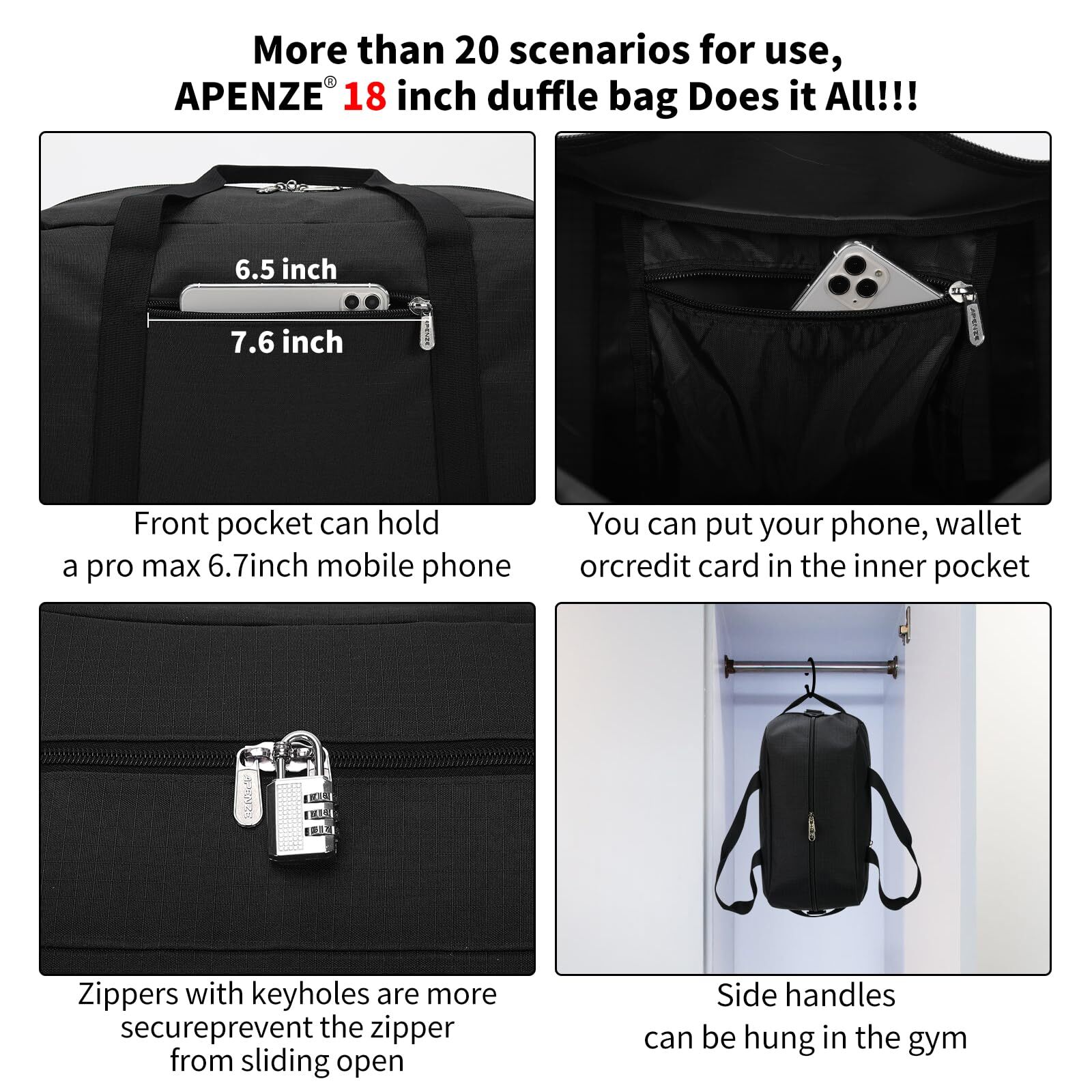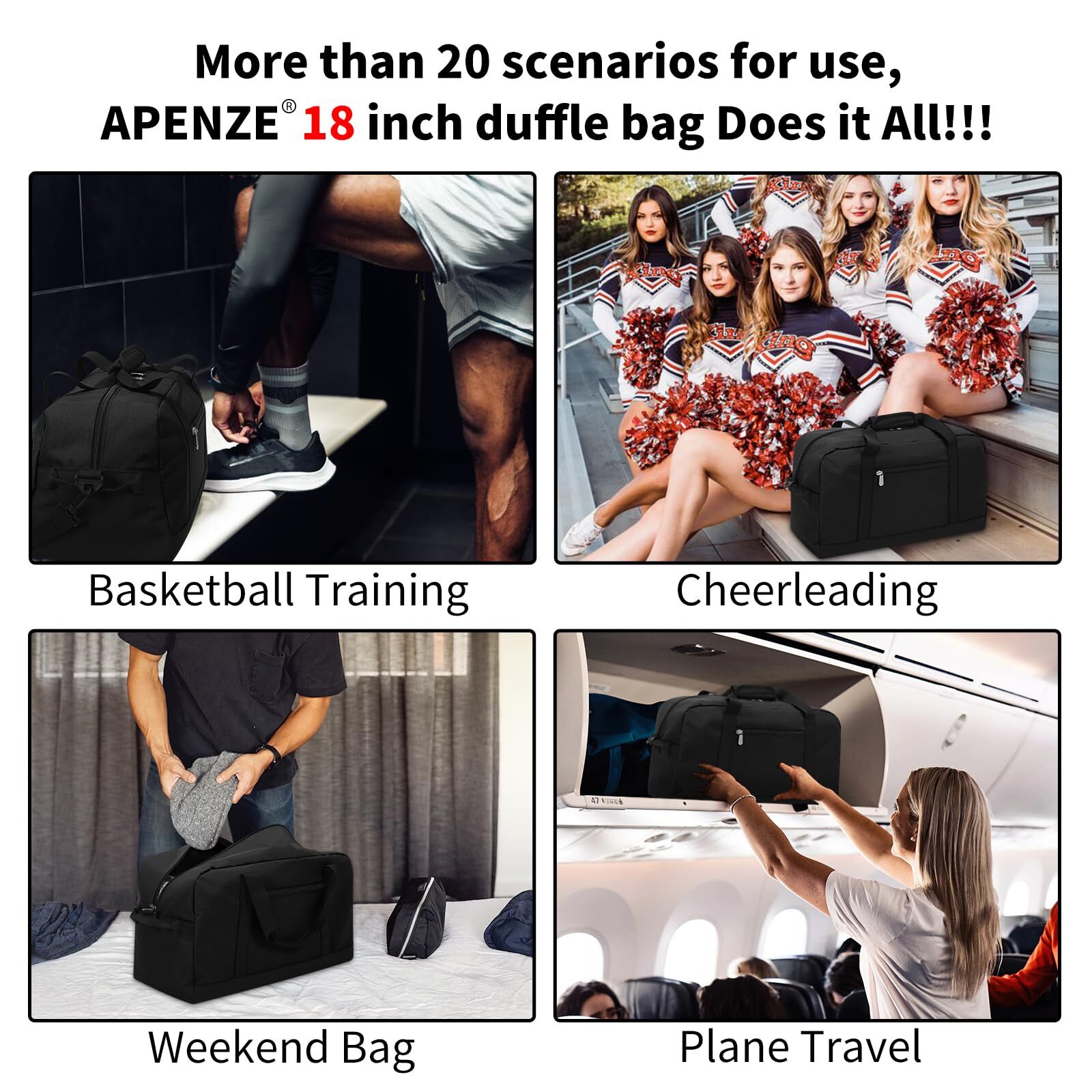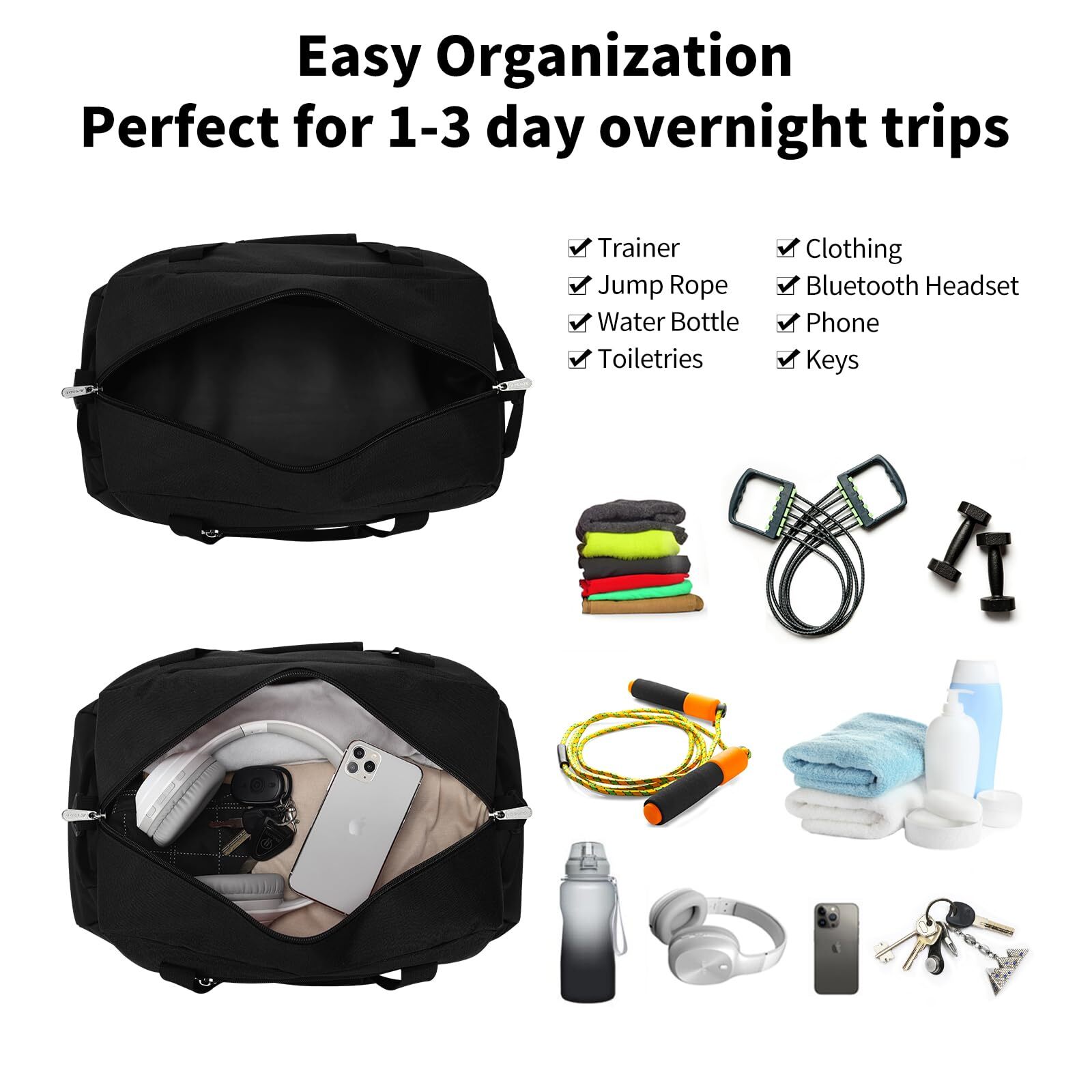 CARRY ON BAG : The size of the small travel bag is 18*9*9 inches, which complies with the airline's carry-on baggage standards and can be taken on the plane and placed under the seat HIGH QUALITY:This is a very functional and versatile gym bag, made of high quality 600D water & tear resistant polyester material, lightweight but well made. Durable and sturdy,not easy to tear when full EASY TO UES:The sport duffel bag has a detachable shoulder strap. The length of the shoulder strap can be adjusted freely, and can be carried on one shoulder or crossbody by adjusting different lengths. There are two hand straps on the top for easy carrying WELL STRUCTURED: This overnight bag is very well constructed and sturdy, it can keep its shape even when it is empty LOCKABLE ZIPPER: The weekend bag uses a double-ended zipper, and the middle of the zipper can be locked with a lock to prevent items from accidentally falling and protect the safety of items.The smooth metal zipper is strong and durable