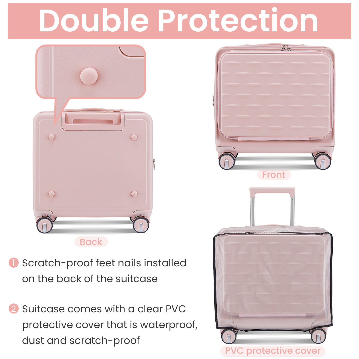 Specification Product Information Item Code:W2098P183687 Product Type:General Item Product Name:18" Carry On Luggage with Front Open Door &Laptop Interlayer, Hard Shell Suitcase Built-In TSA Luggage Lock, Hardside Lightweight PC Travel Suitcase for Women Men with Spinner Wheels Airline Approved Place of Origin:China Main Color:Pink Main Material:PC Product Dimensions Assembled Length (in.):Not Applicable Assembled Width (in.):Not Applicable Assembled Height (in.):Not Applicable Weight (lbs.):Not Applicable Package Size Length (in.):16.00 Width (in.):10.00 Height (in.):16.00 Weight (lbs.):11.00 Product Features 【TSA Combination Lock】 TSA customs locks allow for more security and privacy during the journey, with the ability to perform non-destructive opening and inspection. 【Front Opening Compartment】This suitcase has a front compartment to categorize your computer or iPad and passport registry items for easy access, easy to separate electronic devices from clothing. 【Adjustable & Sturdy Handle】Ergonomic 3-step telescoping handle allows you to maneuver in tight spaces and provide effortless movement. Smooth ups and downs for more comfortable carrying. 【360°Double Wheels】The luggage rollers maneuver very smoothly whether the wheels are on the ground or airport floors. Reduced friction and shock absorption. 【Packaging】】Carry on Luggage Set include: 1*Crossbody Bag (Black), 1*Cosmetic Bag(White), 1*Carry-on Luggage (18 inch )