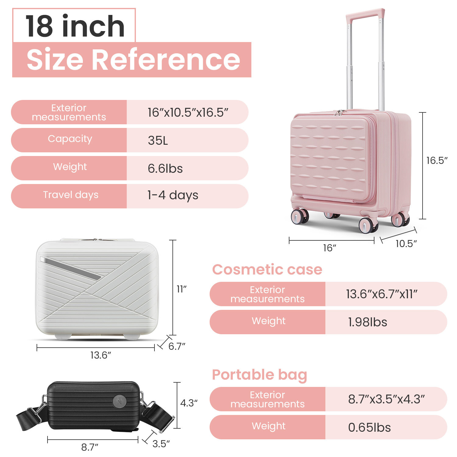 This 18" carry-on is a game-changer for travel! The front-open door and laptop interlayer make access super convenient, while the TSA lock adds security. The hard shell feels durable yet lightweight, and the spinner wheels glide smoothly. Love the included crossbody and cosmetic bags—perfect for keeping essentials organized. The stylish pink color stands out, and it fits airline requirements. Highly recommend for hassle-free trips!