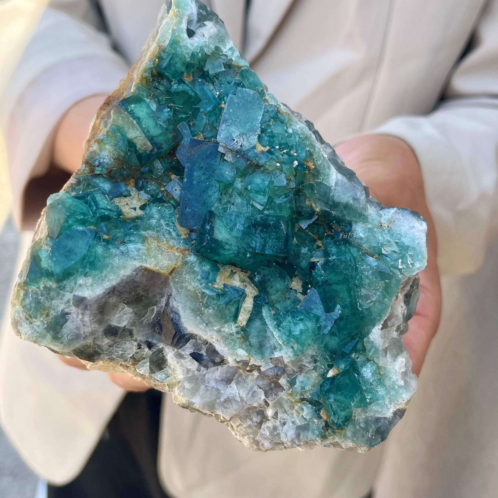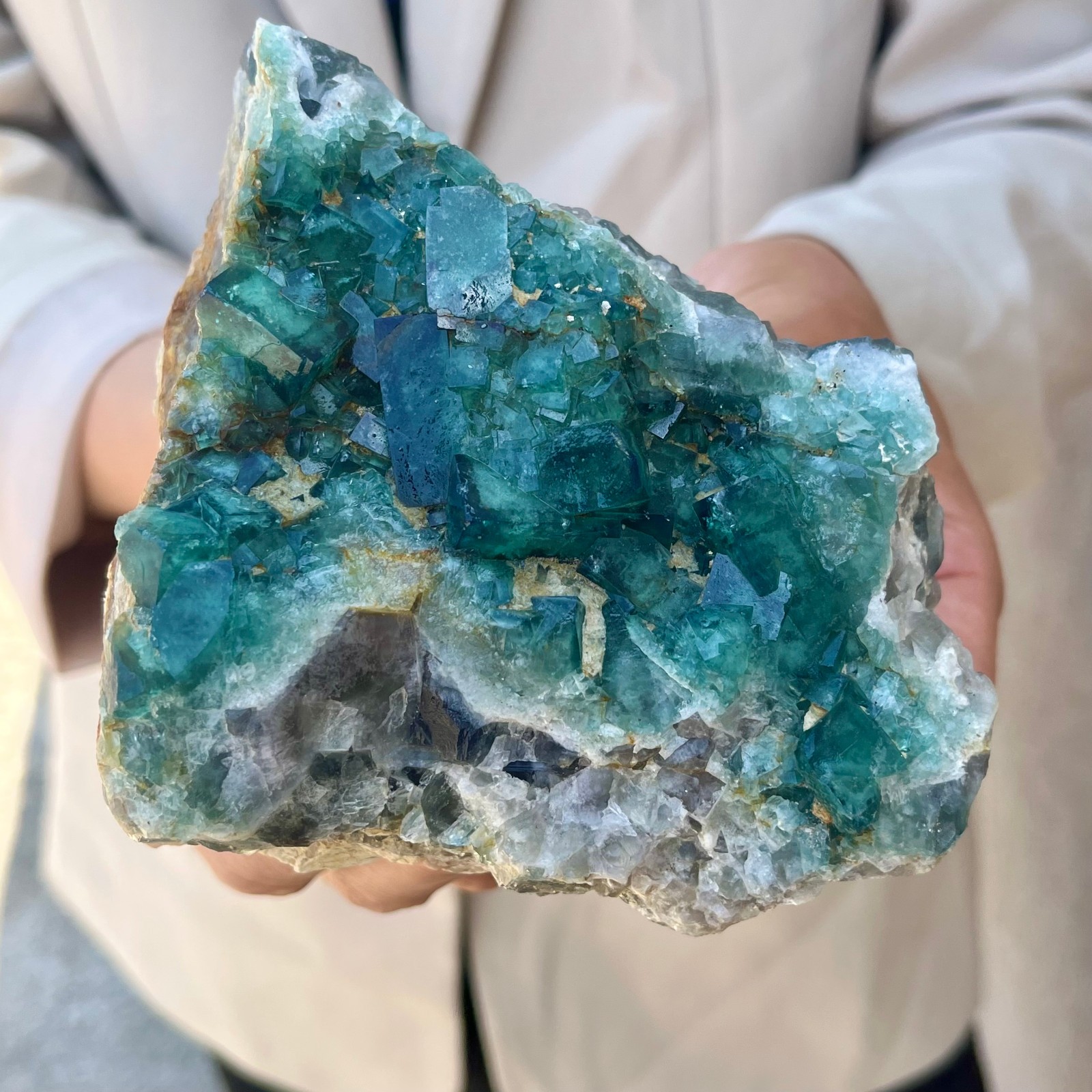 Amazing blue green hues in the fluorite. Item got here super quickly and it was wrapped completely in bubble wrap and tape. It looks exactly like the picture. It’s a solid chonk of a rock with interesting white flecks of crystal on the bottom. A+ transaction!!!