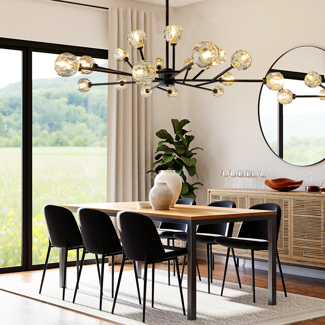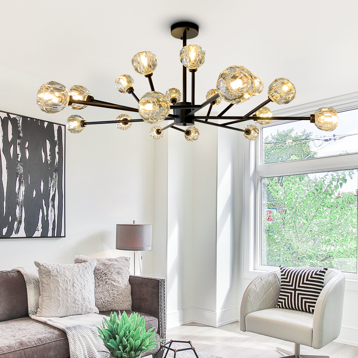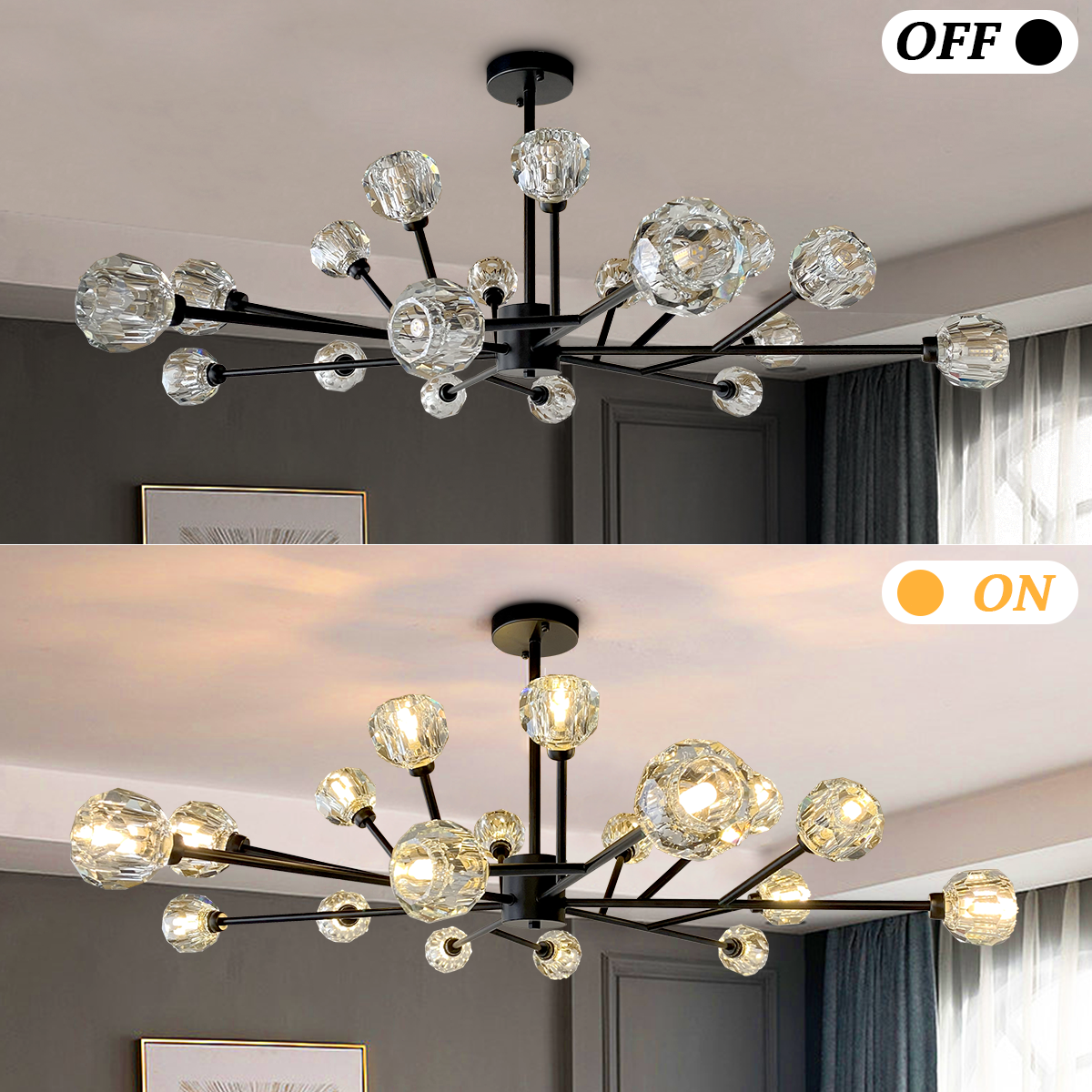 18-Lights Sputnik Chandeliers Mid Century Pendant Light Ceiling Fixture w/Bulbs About this item Crystal Chandelier Size: 43 x 17.7 inches(D*H),2 lower poles: 7.8'' & 11.8''(included).Crystal ball diameter:10cm/3.9in. (Ideal height of floor: 9-12 ft ) Light Source: 18 X G9 bulbs send for free, Neutral light, power: 3W, voltage:110V. Note:The chandeliers for dining room comes in separate parts, need basic assembly. Sputnik Chandelier Material: Superb cutting K9 crystal ball lampshade,soft light and no glare. The dining room chandelier is processed through multiple processes, does not rust, does not fade, and is always bright and new. Suggested Space Size: 20-25 ㎡. It's the perfect modern light fixture to install in kitchen,dining room,living room,foyers and more. Customer Service: If you encounter any problems after received modern chandelier , please contact us firstly and we will do our best to help you.Note:If you need install video, please contact Saffbei customer service. Details: Color: Black Lamp body finished diameter:about 110cm/43" Hanging rod:20cm+30cm/7.87"+11.8" Lampshade diameter:8cm Ligthing source: 18*G9 Led bulbs(Bulbs are sent as a small gift along with the Chandeliers) Voltage:110V Material: Metal+Crystal Applicable: living room, bedroom, restaurant, etc. Packaging details:1 * light pack in foam carton box. Suggestion:Installation By A PROFESSIONAL ELECTRICIAN. Payment Delivery details Terms of sales About us Contact us Payment You could make payment via: Delivery details Packages will ship via by UPS or USPS within our handling time,once the package is shipped out ,normally shipping takes about 3-10 working days,but due to different cities and states,shipping time will be different. Terms of sales If you any problem about shipping information, or the item you got : Arrived damaged; Wrong item sent; Missing parts or pieces; Doesn't work or defective; Doesn't match description or photos. Pls click "Contact Seller" and send us message firstly. Then we could have a check and will take responsibility to resolve the problem with you in good communication. About us Our company specializing in selling all kinds of light fixtures,such as ceiling fans,chandeliers,crystal lights,retro lamps,pendant light,etc. If there's any light fixture you are interested,pls feel free to contact us for more details. Contact us Normally your message will be replied in 1 business day,If after 24 hours you do not receive our reply,please kindly re-send us the message,because sometimes ebay message system will have technical problem,so your message can't send to us successfully.