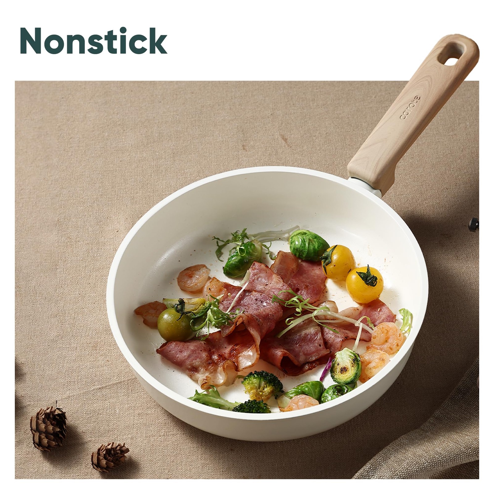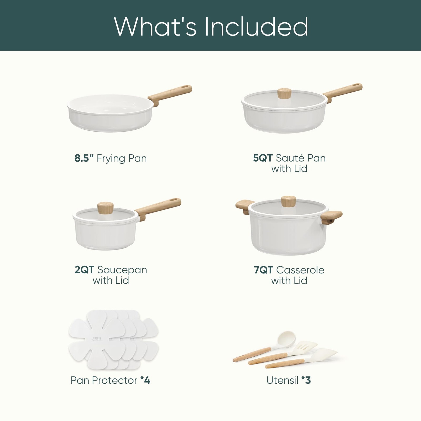 CAROTE 14Pcs Nonstick Ceramic Cookware Set, PFAS/PFOA Free, Cream White Pots and Pans Set Non Stick, Non-toxic Cookware,Kitchen Cooking Pan Set, Large Capacity Crafted with a non-toxic ceramic coating, our cookware brings high level non stick performance and elevate your cooking experience. The smooth ceramic coating doesn’t trap any food or sauce, and wipes clean with just a quick swipe or rinse, keeping your cookware looking brand new. Our cookware is free from harmful chemicals such as PFOA, PFAS, PTFE, lead and cadmium. With its robust design and high-quality ceramic coating, our cookware is built to withstand everyday cooking. While it's designed for durability, its non-stick surface ensures easy cleaning and consistent performance, meal after meal. Carote provides 12 months warranty from the date of purchase. Please don't hesitate to reach out if any quality problem. You will be guaranteed to get satisfying solution. Set includes: 8.5'' frying pan, 2-qt saucepan with lid, 5-qt sauté pan with lid, 7-qt casserole with lid, soup ladle, solid spatula,slotted spatula, 4*pan protectors.