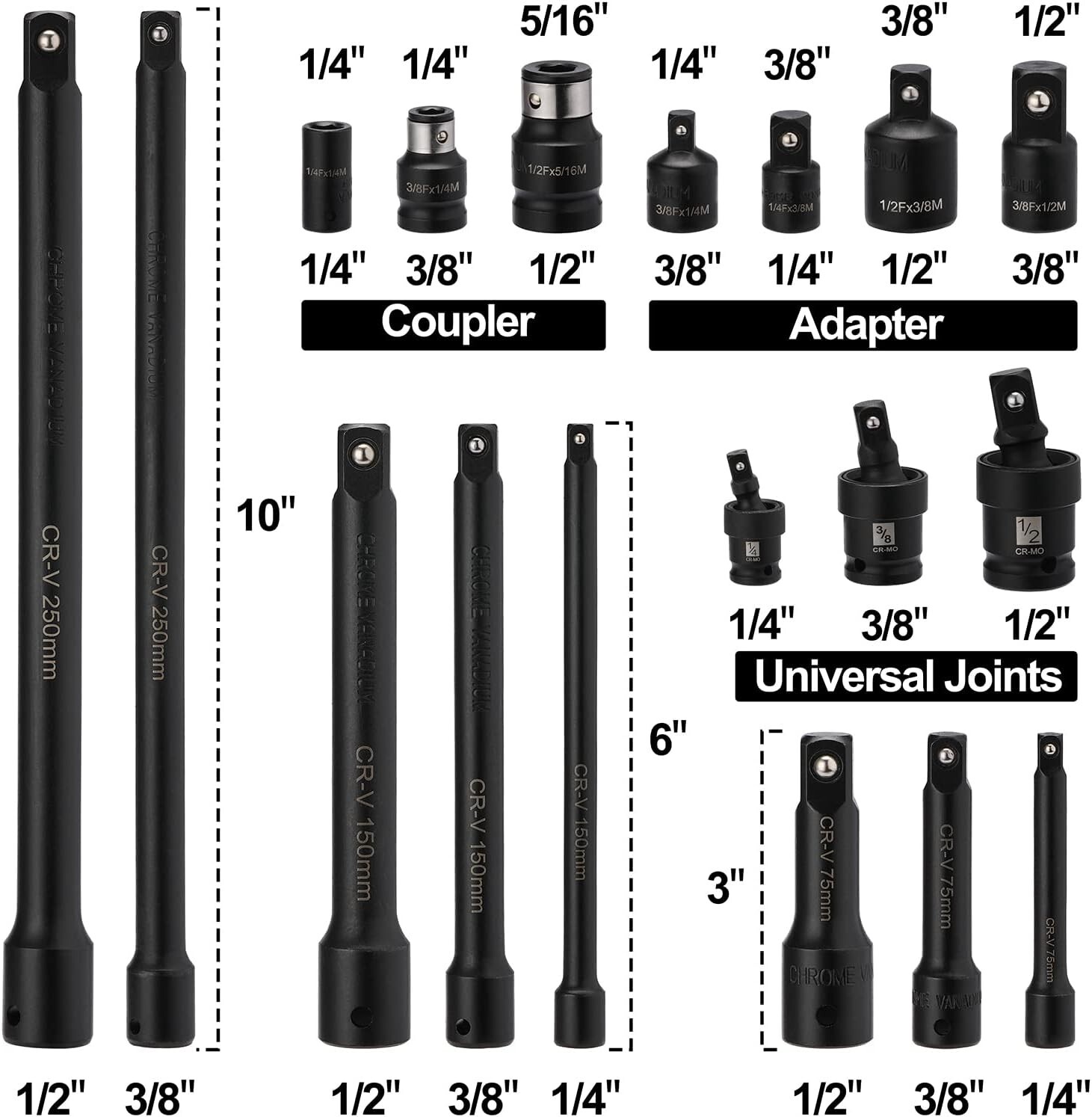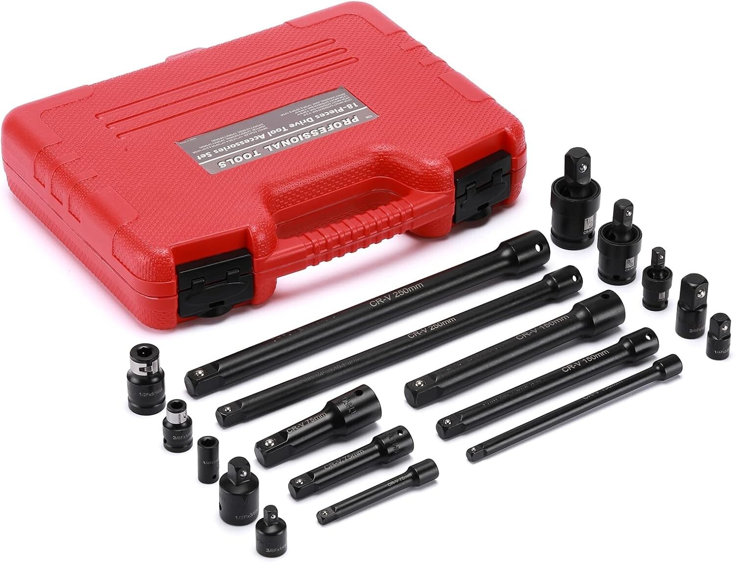 18-Piece Drive Tool Accessory Set Chrome Vanadium Includes Adapters Extensions ‹ › ‹ › ‹ › ‹ › ‹ › ‹ › ‹ › ‹ › ‹ › 18-Piece Drive Tool Accessory Set Craftsmanship Meets Utility Upgrade your toolkit with our meticulously crafted 18-Piece Drive Tool Accessory Set, featuring chrome vanadium steel and designed for both professionals and DIY enthusiasts alike. What's Included: 8 pcs extension bars in 1/4", 3/8", & 1/2" Drive - Perfect for reaching those tough spots. 4 pcs impact socket adapters - For seamless compatibility with various tools. 3 pcs impact universal joints: 1/4", 3/8", & 1/2" Drive - Enhance your maneuverability and access. 3 pcs impact couplers for versatile connections: 1/4"F*1/4"M, 3/8"F*1/4"M, 1/2"F*5/16"M. Unmatched Durability: Constructed from heat-treated chrome vanadium steel. Corrosion-resistant black phosphate finish - Built to withstand the of time. Highly visible markings for easy identification. Convenience and Organization: Includes a durable blow-molded carrying case - Easy transportation and safe storage. Quick organization helps you find the right tool in seconds. Performance You Can Trust: All our tools meet or exceed ANSI & DIN performance standards, ensuring reliability and exceptional quality in every task you undertake. Why Choose This Set? Whether you are a seasoned mechanic or a home handyman, our 18-Piece Drive Tool Accessory Set is an essential addition to your workshop. With its robust design, superb functionality, and convenient storage, you will new heights in tool performance. Embrace the power of effective tools—order your set today and elevate your toolbox to a whole new level of sophistication and functionality! Shipping Free & Fast Shipping - We offer free shipping to most of the USA with a normal delivery time of 3-7 days. However, due to the current situation, additional delivery time (up to 3 weeks) may be required for some items. Alternative Carriers - We may use alternative carriers (e.g. USPS, FedEx, UPS, etc.) to ensure your package arrives safely and on time. Due to the use of multiple carriers, we are unable to provide a tracking number automatically. Handling Time - Orders are processed and shipped within 1-2 business days of receiving cleared payment. Shipping Restrictions - Shipping to Alaska, Hawaii, Puerto Rico, Guam, and other US territories may incur shipping charges or delivery restrictions. Please contact us before ordering, or your order can be refunded/cancelled. State Restrictions - There may be restrictions based on your state of purchase. For example, certain items may not be shipped to California due to state regulations. Contact for Tracking Updates - If you require tracking updates or have any concerns about the delivery of your order, please feel free to contact us, and we will be happy to assist you. Return 30-Day Hassle-Free Returns - We want you to be completely satisfied with your purchase. If you are not, you can return the item within 30 days of receiving it for a full refund or exchange. Easy Return Process - To start a return, simply contact us and we will provide you with a prepaid return shipping label and detailed instructions. Restocking Fee - There are no restocking fees for returns. However, the buyer is responsible for return shipping costs if the return is not due to a seller's error. Refund Processing Time - Refunds will be processed within 5 business days of receiving the returned item in its condition. Payment We accept all major credit cards, PayPal, and Apple Pay for your convenience. Your payment information is secure and encrypted to ensure a safe and seamless transaction. Please complete your payment within 3 days of purchase to avoid any delays in shipping. Feedback Your feedback is extremely important to us. We strive to provide the best products and customer service possible. If you are satisfied with your purchase, please take a moment to leave us a positive review. If you have any concerns or issues with your order, please contact us before leaving negative feedback. We are committed to resolving any problems and ensuring your satisfaction. Contact Us If you have any questions or concerns, please feel free to out to our customer support team. You can contact us through the eBay messaging system. We are available Monday to Friday, 9:00 am to 5:00 pm EST, and we will do our best to respond to your inquiry within 24 hours. Buy it now and enjoy a pleasant shopping experience! Item Diameter: n/a Item Weight: n/a Unit Quantity: 1 Features: Durable,Corrosion Resistant,Easy to Identify,Blow-Molded Case,Heat Treated,Extension Bars,Socket Adapters,Universal Joints,Impact Coupler,Highly Visible Marking Material: Chrome Vanadium Steel,Steel Type: Socket Accessory Set Number of Pieces: 18 Size: 1/4 in Socket Type: Universal System of Measurement: Standard (SAE) Action: Non-Ratcheting Color: Black Unit Type: Unit