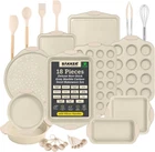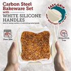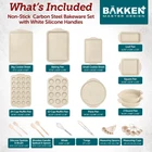 Material Carbon Steel Brand BAKKENMASTER Color White Marble Is Dishwasher Safe No Product Care Instructions Dishwasher Safe About this item COMPLETE 18-PIECE BAKEWARE SET: Includes various pans, trays, utensils, and measuring tools for versatile baking options. HIGH-QUALITY CONSTRUCTION: Made of durable carbon steel with a nonstick white marble coating inside and outside for easy release and cleaning. CONVENIENT SILICONE HANDLES: White silicone handles offer a comfortable grip and stay cool to the touch while baking. VERSATILE USE: Suitable for use in the oven, refrigerator, and freezer, making it perfect for baking a wide range of goods. TEMPERATURE RESISTANT: Withstands temperatures up to 446°F (230°C), ensuring reliable performance in high-heat baking environments.