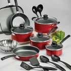 18-piece nonstick cookware set provides all the cookware essentials and is an excellent starter set. The patterned interior nonstick coating ensures easy cooking and simple cleanup. Available in two colors, the dishwasher safe cookware set makes prepping meals for one to many a breeze. Coordinating utensils and pots make this collection both practical and functional. This aluminum cookware set is lightweight and can be used by any level meal preparation person. Stay-cool handles decrease the chance of burning yourself when you are preparing and see-through lids lets you keep close watch on progress. The Tramontina's prima ware 18-piece nonstick cookware set works well with most range types. Riveted, stay-cool handles Heat and shatter-resistant tempered glass lids allow easy monitoring of cooking progress Dishwasher-safe Compatible with gas, electric and ceramic glass cooktops 8" sauté pan, 9" deep sauté pan, 11" griddle, 1 qt sauce pan with lid, 2 qt sauce pan with lid, 3 qt sauce pan with lid, 4 qt Dutch oven with lid (4 qt lid fits the 9" deep sauté pan), stainless steel foldup steamed, solid spoon, slotted spoon, solid turner, slotted turner, pasta spoon, ladle.