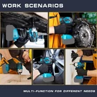 FEATURES & APPLICATION Cordless impact wrench Compatible with MAKITA 18V BL Series Batteries, brushless motor and 4 variable speed control. It is not only suitable for removing tires and lug from cars, motorcycles, pickup truck, utility trailer ,but also can be used for daily household,automotive and boat repairs, vehicle and bicycle, trucks and trailers,Large shelf, heavy equipment maintenance, or product assembly.With compact and cordless design, the high torque impact wrench can easily get into tight spaces others can't. SPECIFICATIONS Rated Voltage: 18volt Max Torque: 420Nm Speed Control: 4 gears Max Speed: 0-3200rpm Output Shaft:1/2inch PACKAGE 1 x Impact Wrench Tool 4 x Sleeve (14mm, 17mm, 19mm, 22mm) 1 x Portable Strap 1 x User's Manual NOTICE: Battery DO NOT Include ! ! ! Impact Wrench Tool Only ! ! ! This impact wrench with cordless design, it is not bound by wires and can be used anywhere. Compatible with MAKITA 18V BL Series Batteries. 4 VARIABLE SPEED CONTROL: This impact wrench is variable speed, once release the switch, the tool stop immediately, provides more security. It also with 4 speed control, you can choose the right gear according to your work needs. 2 IN1 WORK HEAD TURN INTO DRIVER: This electric impact wrench delivers to 420Nm of max torque, the 2 in 1 work head can be turned into a power drill directly without tools. This wrench uses a brushless motor, the power is 300% greater than that of the brushed motor. Rusty or over-tightened nuts and bolts can be easily removal. LED LGITH & 1/2” CHUCK: Impact wrench with 1/2'' chuck can be used for automotive repairs, major construction projects, heavy equipment maintenance, or product assembly. The LED lamps illuminate the work area, allow to use in darkness. REVERSE AUTO STOP: Unique reverse auto stop function prevent misoperation during work, it protect the screw and nut from being damaged and slipping. This function can be turned off.