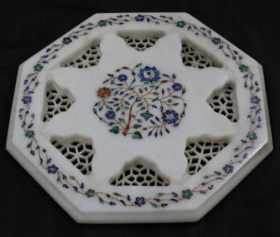 If You Are Looking Something Customize, Let Us Know We Will Make For You As Per Your Design, Size & Shape What is Inlay Art? One of the most attractive work of art that comes from marble is"Marble Inlay" work. It is the same work that adorns the Taj Mahal and other Mughal monuments. It is a closely protected traditional art and only a few expert exponents are available today. The delicate process involves cutting and engraving marble shapes manually. To start with, a predefined pattern e.g., floral design or geometrical design is engraved on the marble slab. Small pieces of marble of different shades are cut delicately to fit in these grooves precisely. These small pieces are then slipped in the grooves. Apart from marble, many other materials can also be used. History Of Inlay Art Inlay work on delicate precious stone began in the workshops of Florence in Italy around the end of the 16th century. This was known as PIETRA DURA.(Pietra= Stone, Dura= Hard) The Italians had created a classic artistic form and held a monopoly over it. From 1630 onward pietra dura appeared on movable, small objects as decorative panels, with bird and flower motifs, suitable for cabinet fronts and table tops. Some of these soon reached the Mughals in the form of presents. Of all the Mughal Emperors, Shah Jahan was the greatest patron of architecture in India. For him no amount of money or time was too much to create enduring, everlasting architectural beauty and through it be remembered always. It is in his buildings that one feels most compelled to make the connection between Mughal art and pietra dura. The Taj Mahal, the cenotaphs of the Emperor and his wife, the main floor and the surrounding marble railings bear very close resemblances to the pietra dura form. Process of Marble Inlay Art Master Craftsman carefully plans a design, which is etched lightly into the marble surface and later scored out with an iron chisel. Many of the tools of the trade are basically the same as those used by the Mughals hundreds of years ago. He then decides on the colour scheme depending on the requirements of piece being created. Semi-precious stones and gems are expertly chosen to give just the right graduation in colour and shade for the overall radiance of the pattern. They are shaped and polished by means of an emery wheel. Sometimes heat treatment is applied to certain stones to get a shading effect. The effort involved in making just one single flower can often take days of work, depending on the detail; it is not unusual to be designed from hundreds of different slices of stone. There are many varieties of coloured stone available for utilisation in marble inlay work: malachite, cornelian, jasper, mother of pearl, abalone shell, lapis lazuli, agnate, coral, turquoise and tiger eye to name just a few. The grooves are filled with their precisely corresponding shapes of coloured stone and secured in place with a white putty made from oil, and wax. Once the design is completely dry, the piece is polished with a mixture of sand, water and emery paper to give a shiny smooth finish. Note:- Customs Duty and other duties levies in destinations country are responsibility of the buyer