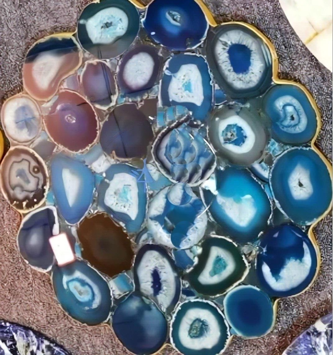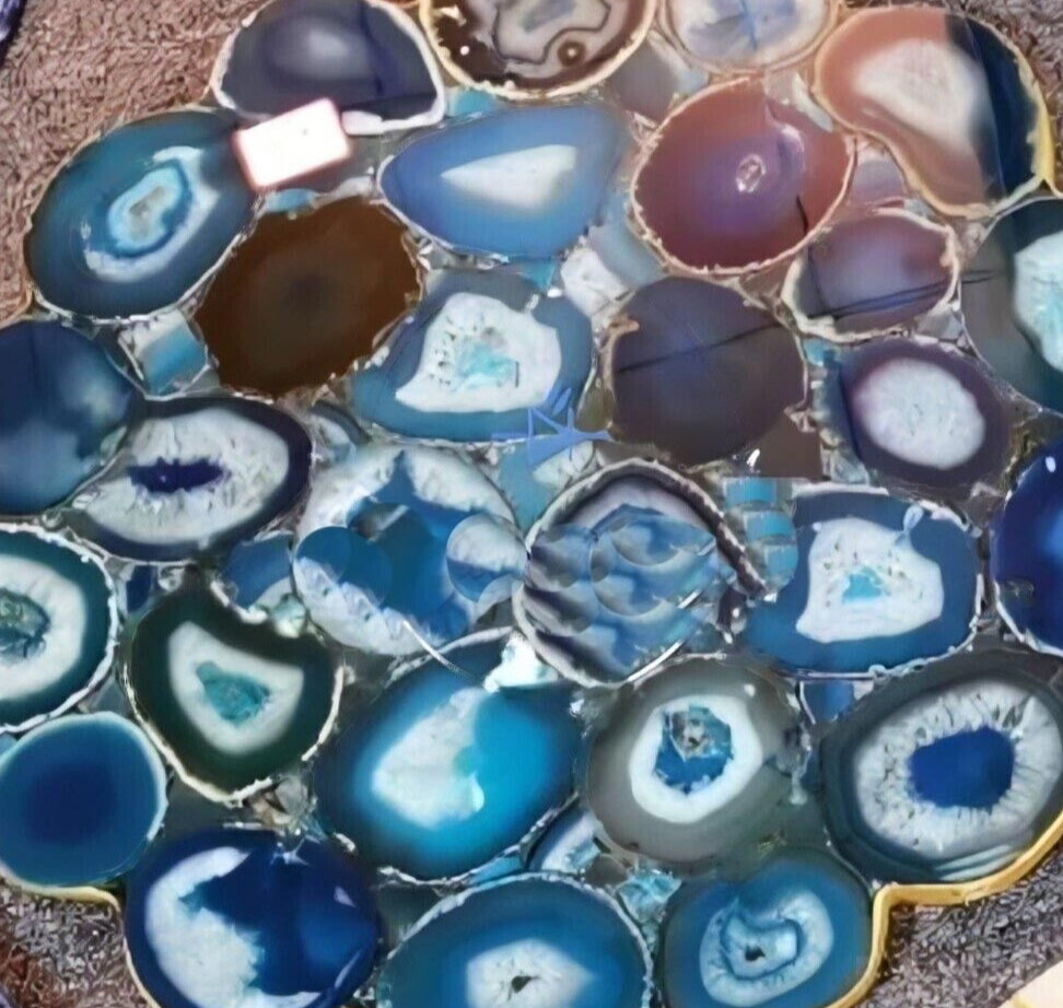 Welcome To Stone-Craft- Creations Shop Description Very unique Art by Indian Artist ,Coffee/Side Table top Used Material: Natural Agate Stones Arts Size: 18"x18" Inches Color: As Photo Shape: Round Pattern: Handmade Room: Bedroom, Dining Room, Hallway, Home Office/Study, Kid’s Bedroom, Kitchen, Laundry/Utility Room, Living Room,Patio, Playroom Packaging: Wood & Foam Export Packing Shipping: Air Can Be customize ,Please Message us your desired Size 1. It can be used as a Dining Table, Guest table, coffee table, center table top in show room as well as a gift for your loved ones. 2. The table top is made in Agra India & fully handmade. 3. The top will be delivered by FedEx or DHL free of cost door to door. 4. If there is any local tax,custom duties or Vat will be paid by the buyer at the destination. 5. The parcel is dispatch with proper packing & fully insured covering all kind of risk. 6. To maintain the table top is simple soap & water & dry cotton cloth. 7. If You Are Looking Something Customize, Let Us Know We Will Make For You As Per Your Design, Size & Shape. 8.Table top does not includes any wooden, marble stand or base if you like to buy marble or wooden base or stand that will be charged extra. Marble Agate Table Tops We are Manufacturer & Exporter of marble agate table tops. These marble agate table tops have different shapes like Round Table top, Octagonal Table Tops, Rectangle / Dining table tops, Square Table tops, Chess Table tops, Taj Mahal Table tops, Custom Designs Table tops also make marble Table top Base and Stand. Then we can be used as dining tables, coffee tables, Center tables, conference tables, chess boards, reading tables, bar tables , Garden table, side and corner tables or any other use as per the indoor and outdoor decor. They can also be placed outdoors in the garden, as marble is stain free, offers great resistance to the forces of nature, and can withstand heavy temperatures. We also meet customized requirement and offer our marble table tops at industry leading prices. About Agate Stone- Agate is a rock consisting primarily of cryptocrystalline silica, chiefly chalcedony, alternating with microgranular quartz. It is characterized by its fineness of grain and variety of color. Although agates may be found in various kinds of host rock, they are classically associated with volcanic rocks and can be common in certain metamorphic rocks. Ancient use of agate stone Agate is one of the most common materials used in the art of hardstone carving, and has been recovered at a number of ancient sites, indicating its widespread use in the ancient world; for example, archaeological recovery at the Knossos site on Crete illustrates its role in Bronze Age Minoan culture Types Of Agate 1. Fortification Agate This is the most common and distinctive type of agate. In these agates, bands crystallized into concentric layers that more or less follow the shape of the cavity. The banding resembles an aerial view of a fort 2. Water-Line Agate (also called water-level or onyx) During its formation, silica-rich solution either entered the cavity slowly laying one band at a time, excess water drained out leaving a small amount of silica to settle out into separate bands, or the vesicle filled under low pressure. In any case, the silica crystallization in water-level agates is controlled by gravity in one orientation, forming a stack up of parallel bands. 3. Shadow Agate Some agates exhibit a shadow effect in which there is what appears to be movement across the agate layers when the specimen is rocked back and forth (or your orientation to the specimen moves). This optical effect only occurs when there are alternating translucent and opaque bands. It is caused when light goes into the agate, but is not reflected out. 4. Tube Agate Tube Agate During the formation of some agates, parallel projections of tiny hair-thin mineral rods grow first within the silica gel, around which later the chalcedony agate micro-crystals form. In some cases the inclusions remain, but sometimes they weather away leaving hollow tubes that subsequently fill in with silica. 5. Eye Agates This mysterious agate characteristic is believed to be formed when most of the silica gel drains from the cavity, leaving only a droplet that “beads up” on the inside wall of the cavity. This droplet crystallizes into solid chalcedony “eyes”. In some cases, crystal growth will continue from this droplet in a manner similar to the formation of stalactites in caves. Later, the pocket fills in with the usual deposition of chalcedony microcrystals. 6. Plume Agate These agates initially had formations on their outside layer that formed prior to the deposition of chalcedony bands. They are filament growths of mineral inclusions that resemble ferns or feathers. 7. Geode Agate Geode Agate In some cases the supply of silica-rich water runs out before the entire cavity fills in. When there is a hollow center within a crystalline outer fill, the specimen is considered a geode. Not all geodes have agate banding, but many do. Also, the inner layers can form into several different types of silica mineral crystals and may even have other types of mineral crystals. 8. Moss Agate Moss Agate Moss agates have clusters of mineral inclusions that resemble plants, trees, or landscapes. Most moss agate inclusions are comprised of iron or manganese oxide. In some cases, the inclusions inhibit chalcedony banding allowing the mineral clusters free reign to grow within the silica gel. 9. Seam Agate Seam agates for in cracks within host rock, rather than in rounder pockets. The bands form in parallel rows that follow and fill in the crack or seam.