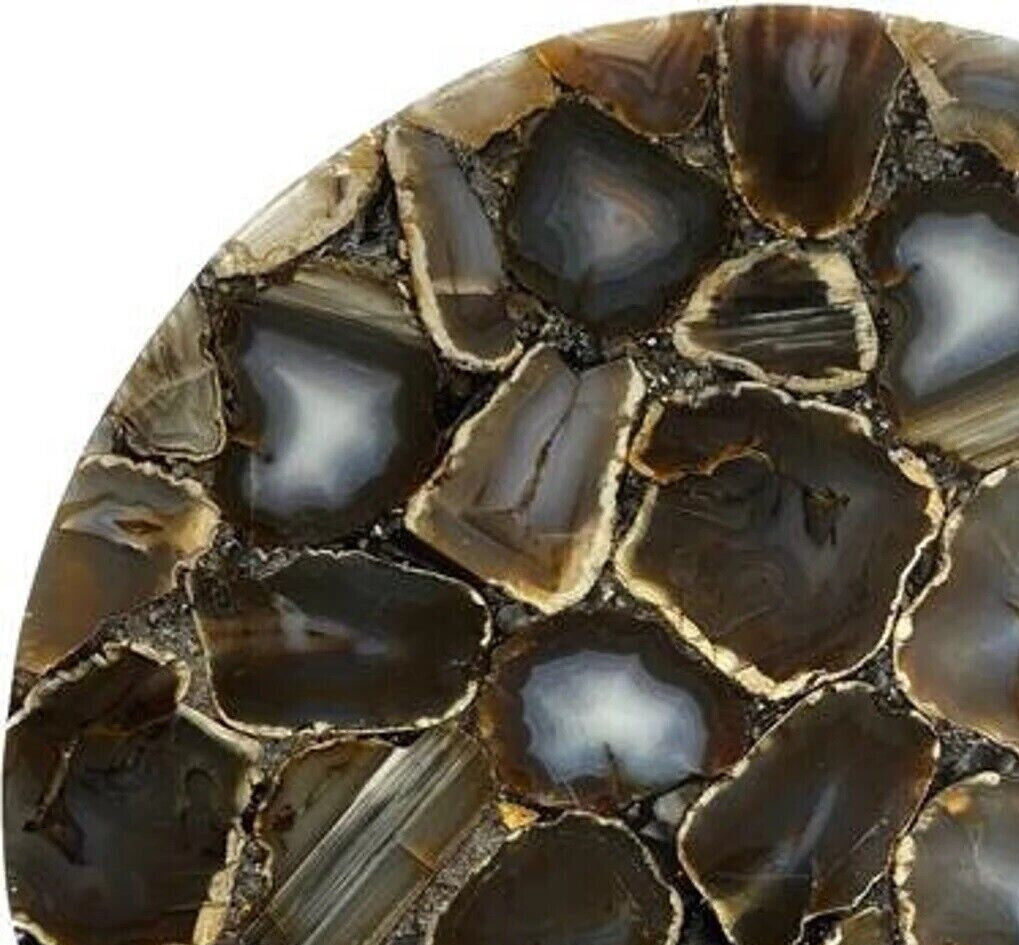 Note : Table top does not includes any wooden, marble stand or base if you like to buy marble or wooden base or stand that will be charged extra , Please message us for leg Welcome To Unique-Handicrafts Shop Description Very unique Art by Indian Artist ,Coffee/Side Table top Used Material: Natural Agate Stone Size: 18"x18" inch Color: As Photo Shape: Round Pattern: Handmade Room: Bedroom, Dining Room, Hallway, Home Office/Study, Kid’s Bedroom, Kitchen, Laundry/Utility Room, Living Room,Patio, Playroom Packaging: Wood & Foam Export Packing Shipping: Air Can Be customize ,Please Message us your desired Size 1. It can be used as a Dining Table, Guest table, coffee table, center table top in show room as well as a gift for your loved ones. 2. The table top is made in Agra India & fully handmade. 3. The top will be delivered by FedEx or DHL free of cost door to door. 4. If there is any local tax,custom duties or Vat will be paid by the buyer at the destination. 5. The parcel is dispatch with proper packing & fully insured covering all kind of risk. 6. To maintain the table top is simple soap & water & dry cotton cloth. 7. If You Are Looking Something Customize, Let Us Know We Will Make For You As Per Your Design, Size & Shape. 8.Table top does not includes any wooden, marble stand or base if you like to buy marble or wooden base or stand that will be charged extra. Marble Agate Table Tops We are Manufacturer & Exporter of marble agate table tops. These marble agate table tops have different shapes like Round Table top, Octagonal Table Tops, Rectangle / Dining table tops, Square Table tops, Chess Table tops, Taj Mahal Table tops, Custom Designs Table tops also make marble Table top Base and Stand. Then we can be used as dining tables, coffee tables, Center tables, conference tables, chess boards, reading tables, bar tables , Garden table, side and corner tables or any other use as per the indoor and outdoor decor. They can also be placed outdoors in the garden, as marble is stain free, offers great resistance to the forces of nature, and can withstand heavy temperatures. We also meet customized requirement and offer our marble table tops at industry leading prices. About Agate Stone- Agate is a rock consisting primarily of cryptocrystalline silica, chiefly chalcedony, alternating with microgranular quartz. It is characterized by its fineness of grain and variety of color. Although agates may be found in various kinds of host rock, they are classically associated with volcanic rocks and can be common in certain metamorphic rocks. Ancient use of agate stone Agate is one of the most common materials used in the art of hardstone carving, and has been recovered at a number of ancient sites, indicating its widespread use in the ancient world; for example, archaeological recovery at the Knossos site on Crete illustrates its role in Bronze Age Minoan culture Types Of Agate 1. Fortification Agate This is the most common and distinctive type of agate. In these agates, bands crystallized into concentric layers that more or less follow the shape of the cavity. The banding resembles an aerial view of a fort 2. Water-Line Agate (also called water-level or onyx) During its formation, silica-rich solution either entered the cavity slowly laying one band at a time, excess water drained out leaving a small amount of silica to settle out into separate bands, or the vesicle filled under low pressure. In any case, the silica crystallization in water-level agates is controlled by gravity in one orientation, forming a stack up of parallel bands. 3. Shadow Agate Some agates exhibit a shadow effect in which there is what appears to be movement across the agate layers when the specimen is rocked back and forth (or your orientation to the specimen moves). This optical effect only occurs when there are alternating translucent and opaque bands. It is caused when light goes into the agate, but is not reflected out. 4. Tube Agate Tube Agate During the formation of some agates, parallel projections of tiny hair-thin mineral rods grow first within the silica gel, around which later the chalcedony agate micro-crystals form. In some cases the inclusions remain, but sometimes they weather away leaving hollow tubes that subsequently fill in with silica. 5. Eye Agates This mysterious agate characteristic is believed to be formed when most of the silica gel drains from the cavity, leaving only a droplet that “beads up” on the inside wall of the cavity. This droplet crystallizes into solid chalcedony “eyes”. In some cases, crystal growth will continue from this droplet in a manner similar to the formation of stalactites in caves. Later, the pocket fills in with the usual deposition of chalcedony microcrystals. 6. Plume Agate These agates initially had formations on their outside layer that formed prior to the deposition of chalcedony bands. They are filament growths of mineral inclusions that resemble ferns or feathers. 7. Geode Agate Geode Agate In some cases the supply of silica-rich water runs out before the entire cavity fills in. When there is a hollow center within a crystalline outer fill, the specimen is considered a geode. Not all geodes have agate banding, but many do. Also, the inner layers can form into several different types of silica mineral crystals and may even have other types of mineral crystals. 8. Moss Agate Moss Agate Moss agates have clusters of mineral inclusions that resemble plants, trees, or landscapes. Most moss agate inclusions are comprised of iron or manganese oxide. In some cases, the inclusions inhibit chalcedony banding allowing the mineral clusters free reign to grow within the silica gel. 9. Seam Agate Seam agates for in cracks within host rock, rather than in rounder pockets. The bands form in parallel rows that follow and fill in the crack or seam.