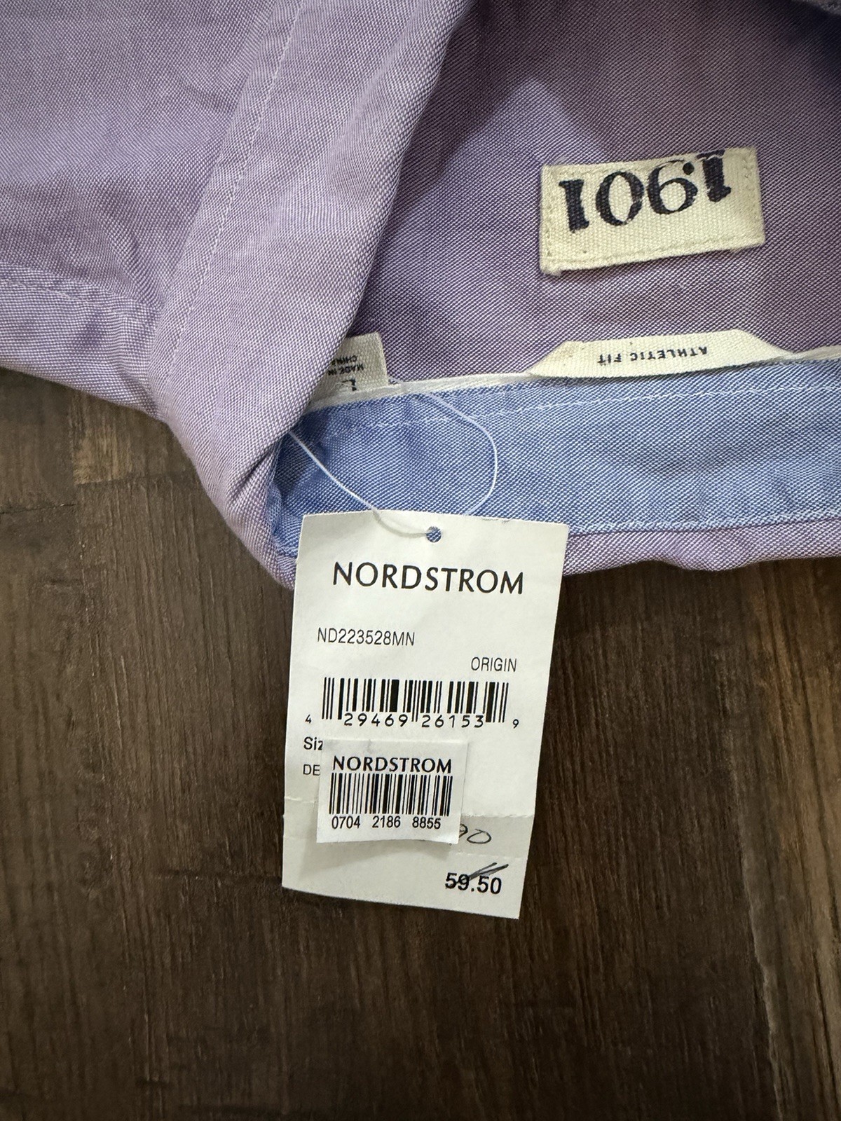 The 1901 Nordstrom NWT Athletic Fit Long Sleeve Button Down Shirt in size Large is a stylish and versatile addition to any man's wardrobe. Made from comfortable cotton material, this shirt features a solid purple color with a button-up closure and collared neckline. The athletic fit provides a modern silhouette, while the long sleeves and pockets add practicality. Perfect for casual occasions year-round, this shirt is a timeless piece with a touch of sophistication from a reputable brand like Nordstrom.