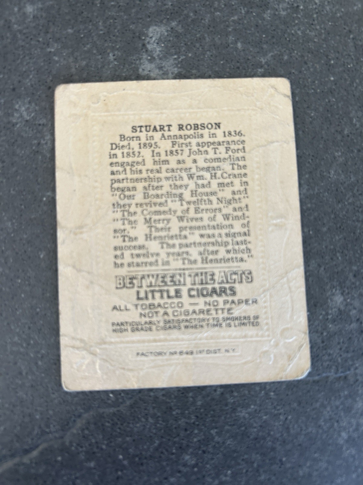 Delve into the nostalgia of early 20th-century entertainment with the 1910 Little Cigars Between the Acts Tobacco Card featuring Stuart Robson. A true collectible, this card hails from the United States, offering a glimpse into the bygone era of tobacco culture and vaudeville. The card showcases the famed actor, capturing a moment of vintage performance art that will be a cherished piece for enthusiasts and historians alike. This tobacco card is a testament to the artistic and cultural legacy of its time. Whether you're a collector of vintage cards or a lover of theater history, this Stuart Robson card is a unique find that celebrates the rich tapestry of American entertainment. Add this piece to your collection and own a fragment of history.