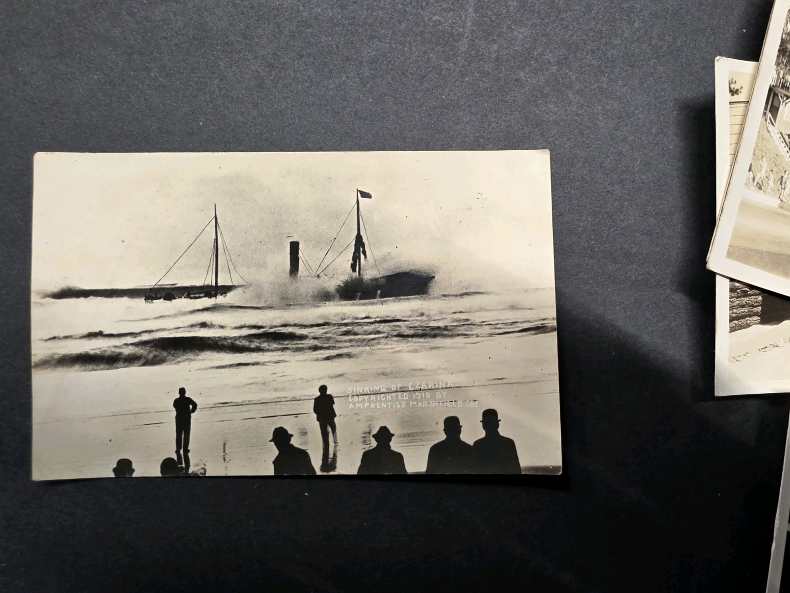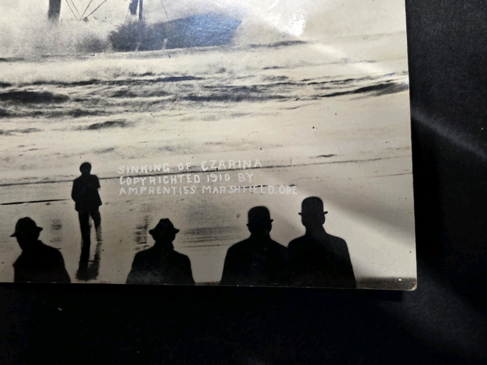 This is an original Real Photo Postcard (RPPC) showing the aftermath of the 1910 sinking of the steam schooner S.S. Czarina at the mouth of Coos Bay, Oregon. Caption reads: “Sinking of Czarina – Copyrighted 1910 by F.M. Frintiss, Marshfield, Ore.” Frintiss was a well-known early Oregon photographer whose regional disaster and harbor images are scarce and highly collected. This postcard is guaranteed original and period-printed. AZO stamp box on reverse matches 1907–1918. Condition: Light wear and age spots as shown. No writing on back. Strong contrast, sharp image, and excellent survivor for a 115-year-old real photo postcard. A great piece of Oregon maritime history