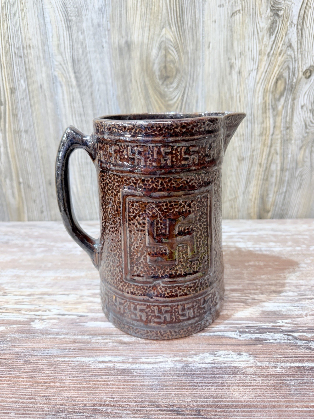 This 1920s Native American Whirling Log Brownware Stoneware Pottery Milk Pitcher is a vintage piece originating from the U.S.A. It features a round shape with a decorative Arts & Crafts/Mission Style design, showcasing an antique Native American Indian peace sign symbol. Handmade with a salt glaze finish, this one-of-a-kind pitcher has a half-gallon capacity, making it a unique and primitive Americana piece perfect for collectors of antique stoneware. The Nelson McCoy Sanitary Stoneware Co., the Crooksville Pottery Co. and the Robinson-Ransbottom Pottery Co. all made similar pitchers. The wonderful earthy brown color and American Indian stoneware material add to its charm and historical significance. It is in good as pictured condition, please view all photos for best visual description. It measures eight 8 1/4 inches high by 7 1/2 inches from handle to spout.