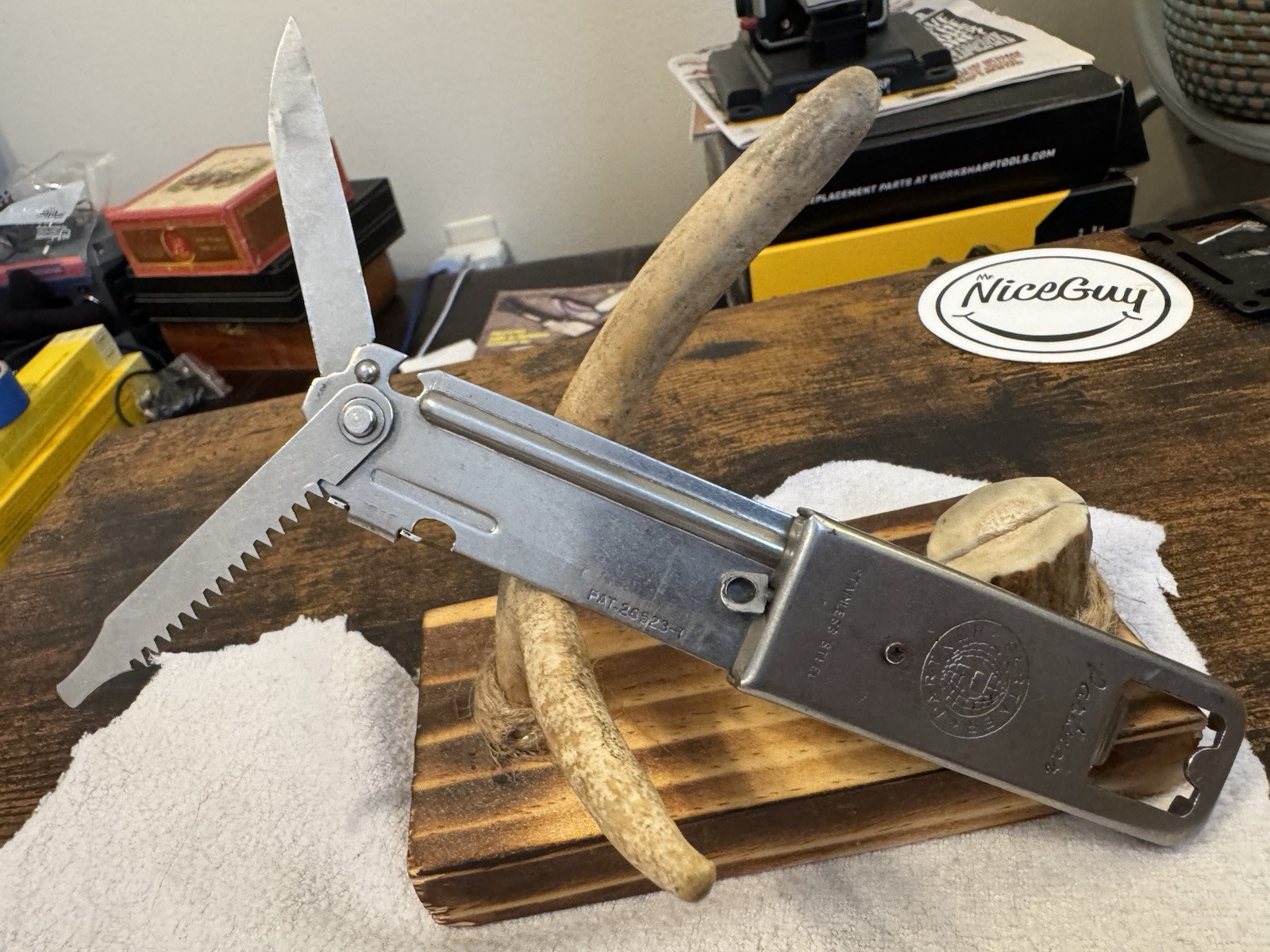This vintage multi-tool knife from the 1920s features three blades and a bottle opener. It is an original United States manufactured item with a stainless steel handle. The item is believed to be a manufacturer's sample due to its unique design and vintage nature.