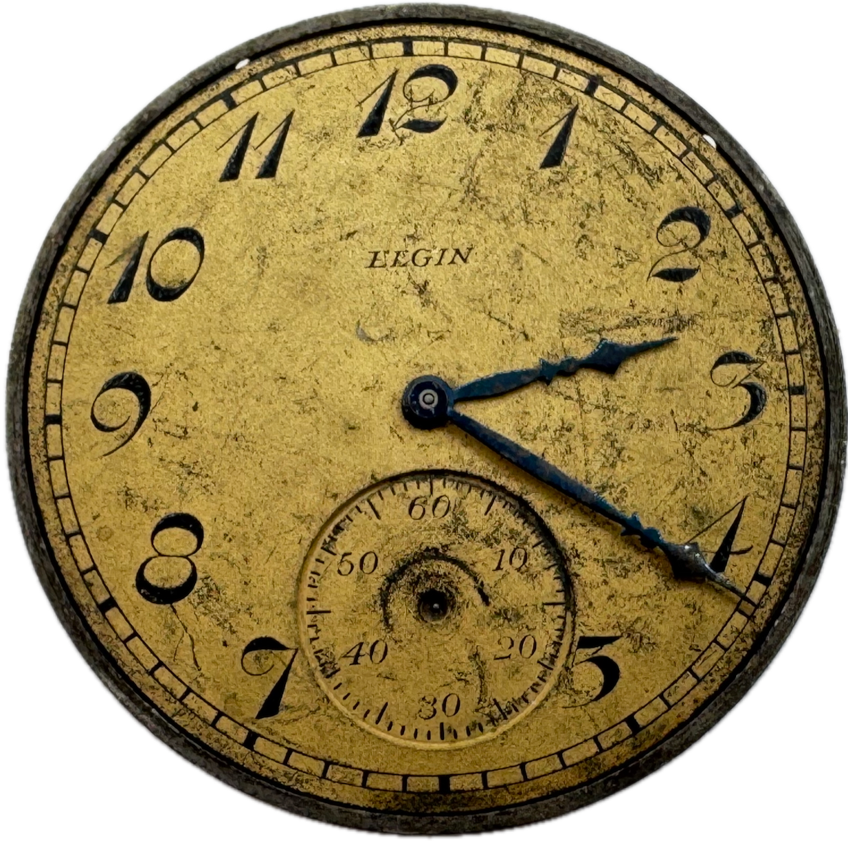 Antique 12s 1924 Elgin 7 Jewel Mechanical Pocket Watch Movement 303 USA Product Description Item: Pocket Watch Movement Brand: Elgin Movement: Mechanical Production Year: 1924 Country: USA Jewels: 7 Jewel Gender: Men's Grade: 303 Size: 12s Product Measurements Diameter: 39.5mm Product Condition Overall Condition: Poor, overall condition for its age. Functions: Not running but the balance complete is in good condition. Dial: The dial has scratches and discoloration. Hands: There is discoloration on the hands.