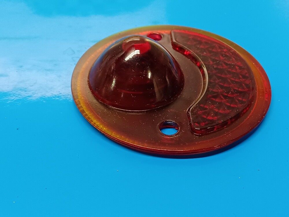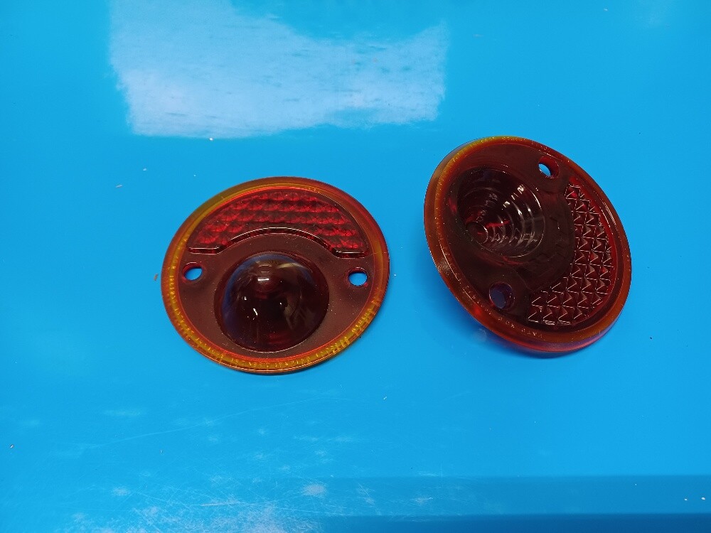 HERE IS A PAIR OF GLASS TAIL LIGHT LENSES THAT I THINK WERE USED ON 29 - 31 DODGE, DURANT, DESOTO, PLYMOUTH, GRAHAM PAIGE AND MAYBE OTHERS.. THESE ARE NEW GLASS LENSES FROM A 70+ YEAR OLD MOLD. THE LENSES ARE ABOUT 3 1/2" ACROSS AND THE MOUNTING HOLES ARE ABOUT 2 1/2" APART AND DOWN FROM THE TOP APPROX 2" (NOT CENTERED). THANKS FOR LOOKING. CHECK MY LISTINGS FOR A DIFFERENT STYLE OF THE SAME LENS. PICTURE WITH THE RING IS TO SHOW HOW THE LENS LOOKS WITH THE CORRECT BEZEL..... BEZEL NOT INCLUDED ALL MY GLASS TOOLING IS FROM THE FORMER M&M GLASS COMPANY AND MADE THE SAME WAY AT THE SAME PLACE IN OHIO SINCE THE 1960's THESE LENSES ARE HAND PRESSED GLASS MADE IN THE USA WITH THE ORIGINAL MOLD I OWN. FREE SHIPPING TO USA ADDRESS. ALL OTHERS PAY SHIPPING
