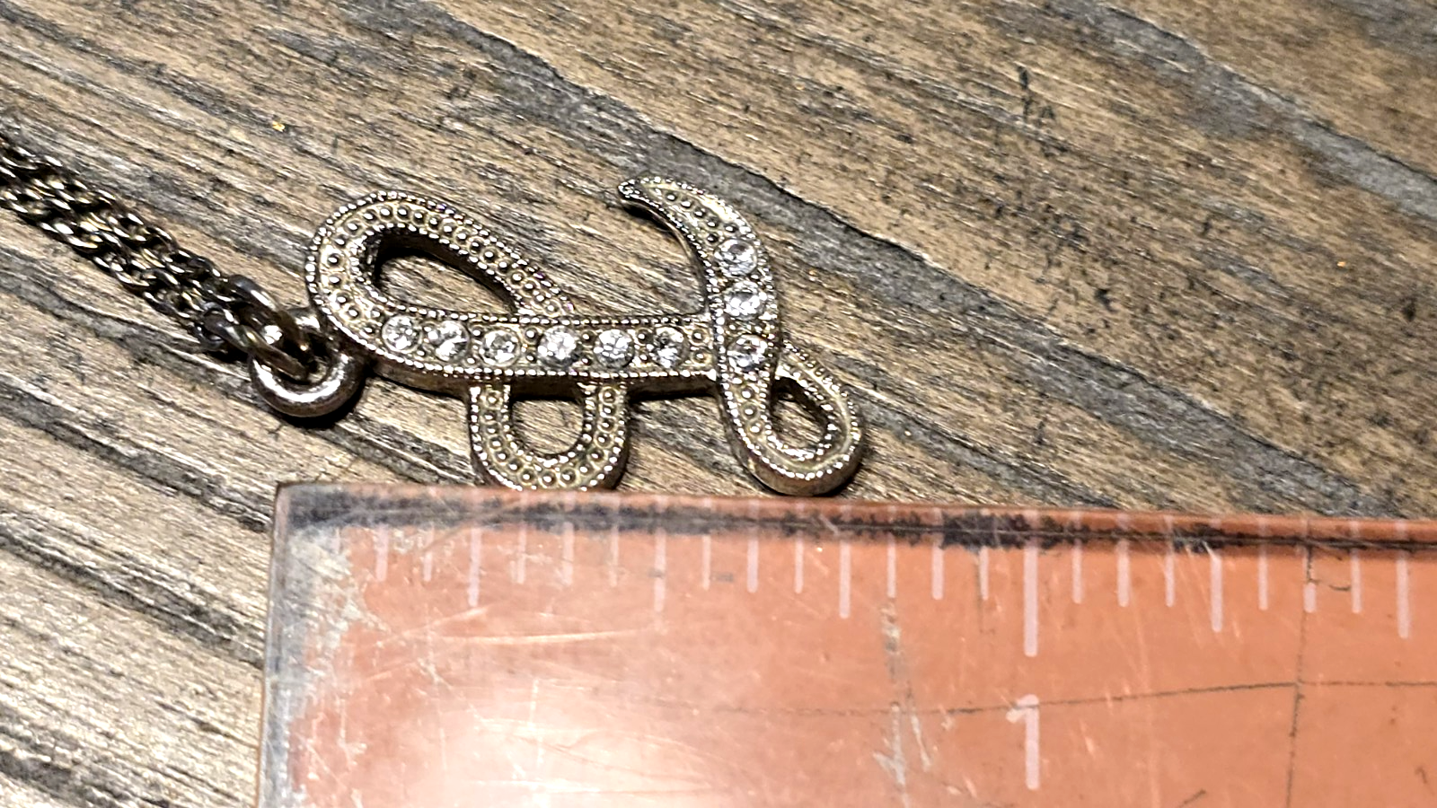 This is a silver tone necklace with letter "L" initial pendant by 1928. The pendant is 3/4 inch tall with rhinestones and high quality dotted edge detailing that give it a 3D look. Condition is very good, wear is very light. Thanks for looking! Please ask any questions BEFORE purchasing, and see my other listings for more!
