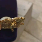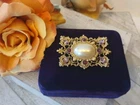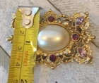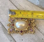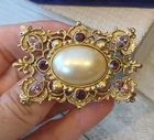 This beautiful antique revival brooch is a perfect addition to any jewelry collection. With a unique combination of gold tone metal, faux pearls, and rhinestones, it has a vintage feel that is sure to catch anyone's attention. The brooch features a cabochon-shaped glass stone in a pavé setting, with a purple cream gold color that adds a touch of elegance to any outfit. The brooch is perfect for a variety of occasions, including engagement, wedding, anniversary, graduation, and more. It is a great gift for Mother's Day, Christmas, birthdays, and other special events. The brooch is signed and comes with a seller warranty, ensuring its authenticity and quality. Add this antique revival brooch to your collection today! Pre Owned see photos for sizing and condition. Please ask any questions before purchase, No Returns, prompt payment and thanks for looking. Shipped usps ground advantage mail. Box is display only. Ask about the combined shipping discount before payment. Happy shopping:)