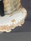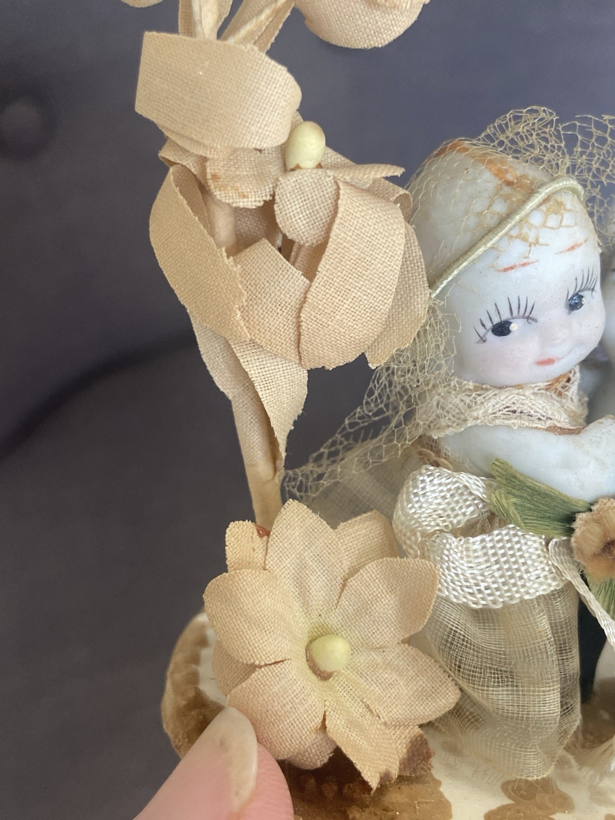Adorable antique cake topper featuring a couple under a floral type of arbor. The bottom is a little rough around the edges and it may just stick into the cake for a firm grip this beautiful antique cake topper is 6 inches tall.