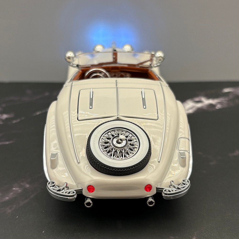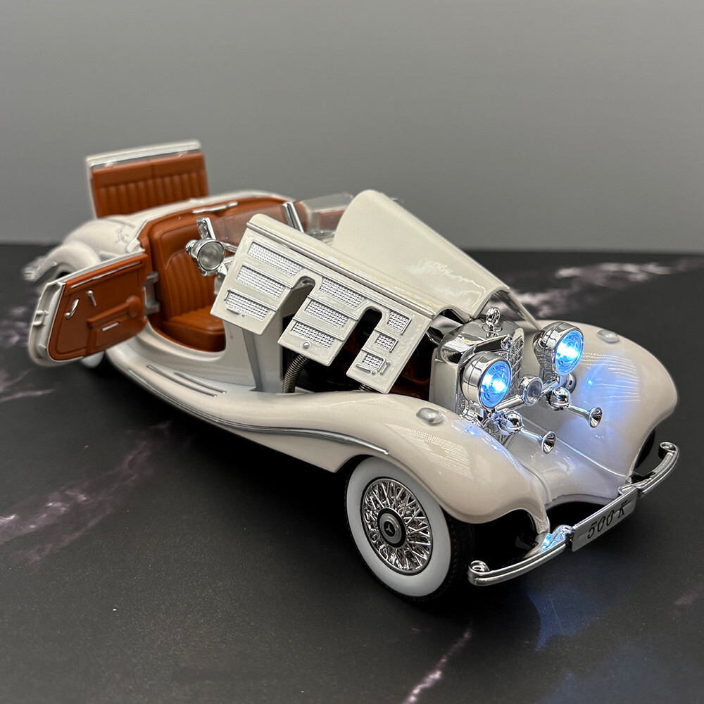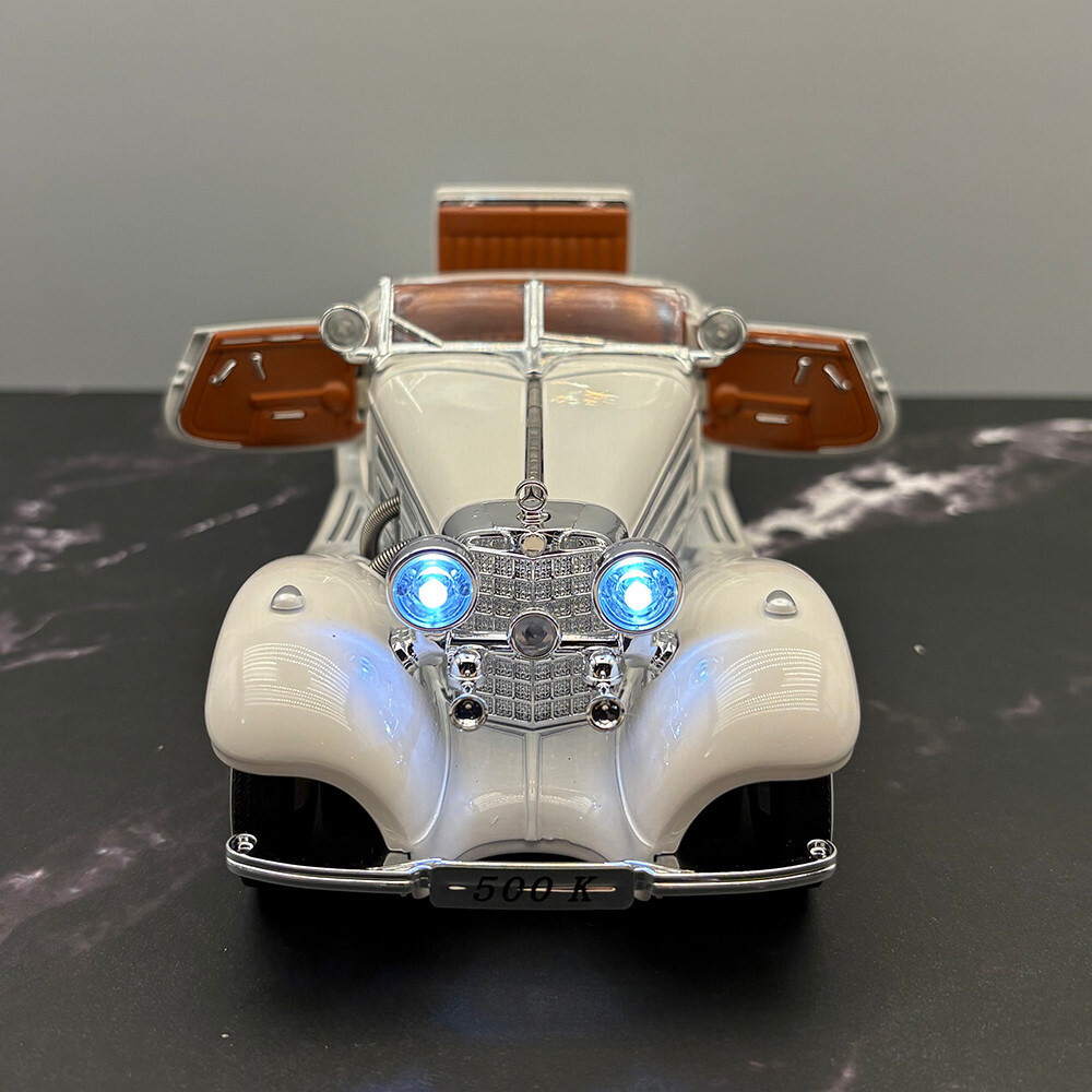 1934 Mercedes 500K Roadster - White - 1:24 Diecast Model - With Opening Doors - Hood - Trunk - Lights - Sound. The Batteries And Box Are Included. It Measures 8 Inches Or 20 CM In Length And 3 Inches Or 7.6 CM In Width. In Stock And Ready To Ship. We Combine Shipping On All Our Orders.