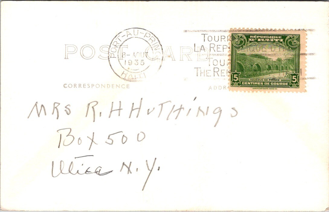 Beautiful 1935 postcard featuring the Ministry Offices in Port-au-Prince, Haiti, complete with vintage automobiles and crisp architectural details. Postmarked from Haiti with a 5 centimes de gourde stamp. A rare glimpse of governmental life during the 1930s in the Caribbean.