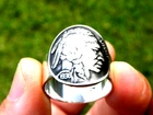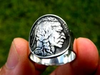 Thank you for interesting Circulated vintage Buffalo Indian nickel coin curved and soldered .925 sterling silver 10 mm ring band. Signet ring for 9 finger size. Comes with in nice gift box. You will receive similar to pictured ring Indian showing side coin ring. . I can make with Buffalo showing side if you prefer.. Please let me know when you purchase. Please check my other items I make necklaces, cuff links, and bracelets with authentic coins and customize to wrist size bracelets with genuine Buffalo Bison leather and Alligator leathers.