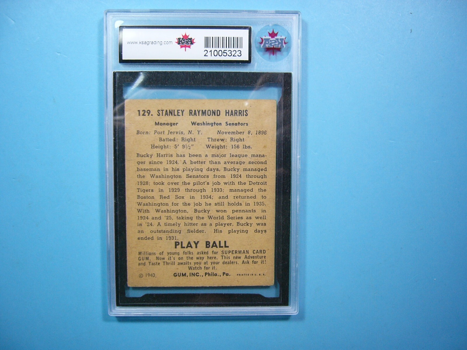 YOU ARE BIDDING ON A 1940 PHILADELPHIA GUM PLAY BALL GUM INC. MLB BASEBALL CARD, #29 BUCKY HARRIS, ROOKIE CARD, MANAGER, WASHINGTON SENATORS. CARD IS GRADED 4 BY KSA IN VERY GOOD/EXCELLENT CONDITION. SEE SCANS FOR FURTHER CONDITION. A VERY SHARP-LOOKING, CLEAN & ATTRACTIVE VERY IMPORTANT HIGH VALUE CARD FROM THIS VINTAGE PLAY BALL BASEBALL CARD SET!!! THANKS FOR LOOKING AND GOOD LUCK!!! ------------------------------------------------------------------------------------------------------------------------------------------- SHIPPING WITHIN CANADA WITH TRACKING & INSURANCE IS $12.50, TO THE UNITED STATES $15.00 AND INTERNATIONALLY $60.00 (EVERYWHERE ELSE). ITEM WILL BE CAREFULLY PACKAGED SO AS NOT TO GET DAMAGED DURING SHIPPING. WE DO COMBINE SHIPPING ON MULTIPLE PURCHASES--ONLY 50 CENTS PER ADDITIONAL GRADED CARD OR ONLY 20 CENTS MORE PER ADDITIONAL SINGLE UNGRADED PHOTO OR CARD. TAKE A LOOK AT MY OTHER AUCTIONS AND SAVE ON SHIPPING!!!