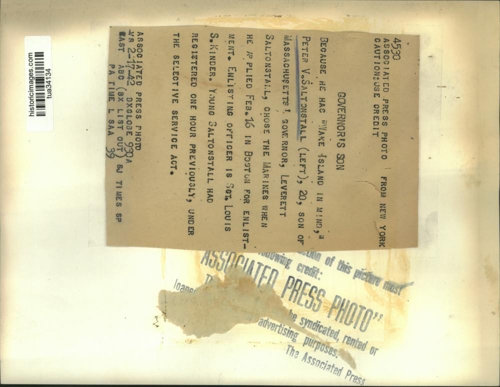 ebay template Note: Please study the images carefully to determine the condition of this vintage photograph, as it may not be in perfect condition. It may contain wrinkles, cracks, and possibly even tears due to its age and how it was handled before it got to us. A scanner may interpret colors and contrast differently than human eyes will, so it is possible that the actual photograph may be slightly darker or lighter in person. This vintage photograph is offered for sale as a collectible item and conveys no transfer of copyright. 1942 Press Photo Peter V Saltonstall talks with US Marine Sergeant Louis Kinder This is an original press photo. Because he as "Wake Island in Mind," Peter V Saltonstall (left), 20, son of Massachusetts Governor, Leverett Saltonstall, chose the Marines when he applied February 16 in Boston for enlistment. Enlisting officer is Sergeant Louis S Kinder. Young Saltonstall had registered one hour previously, under the selective service act. Photo measures 9.25 x 7 inches. Photo is dated 02-16-1942. PHOTO FRONT PHOTO BACK Historic Images Part Number: tua34134 FAQs Q: Can I just download a digital version instead? A: No, we sell only vintage originals and do not make or distribute any copies, including digital ones. Q: Do you combine shipping and invoices? A: Multiple photos won on the same seller ID combine automatically through the eBay checkout process. If you encounter problems with this, send us a message via eBay messaging and we will send you an invoice. Due to eBay limitations, we cannot combine items won on our different seller IDs for a single shipping charge. Q: How quickly do you ship the items once paid? A: We ship within one business day after your payment clears. If you do not receive an "order shipped" email from us by the close of the second business day from submitting payment, please e-mail us via eBay messaging. Q: How do you make sure my photograph arrives safely? A: We package each order between two cross-corrugated pieces of cardboard to ensure that the package is as difficult to bend as possible. We then wrap each order in a plastic sheet to help protect against moisture. We want you to rest assured that we take every precaution to ensure that the photograph you receive will be in the same condition in your care as it was in ours. Q: Will the "Historic Images" watermark be on my photo when I receive it? A: No. This is a digital watermark we use to protect our images. It is not printed on the photo. Q: What are your office hours? A: eBay for us is a business, and a very fun one to be in! We are open M-F 9 to 5 (CST). Therefore, we do not return e-mails and phone calls over the weekend. We observe the following holidays: New Years Day, Memorial Day, Fourth of July, Labor Day, Thanksgiving and the day after Thanksgiving, Christmas Eve and Christmas Day. Q: Where did all these vintage photos come from? A: These original vintage photographs are from various news service and newspaper photo archives from locations around the country including: Boston, Detroit, Tampa, Chicago, Denver, Seattle, New Orleans, Milwaukee, Portland, Spokane, and more. We do not copy or reproduce any photographs -- every item is a unique vintage piece that was housed in a news archive. Q: Can I use this photograph in my book/blog/website? A: The short answer is no. There is no transfer of copyright for republication or reproduction with these photographs when you purchase them, and only photographs taken before 1923 are currently automatically in the public domain. Permission from the copyright holder, which usually can be identified from the back of each photo, must be sought to republish or reproduce the image for any purpose. Q: Do you relist items (in case I miss an auction ending)? A: Auction items that receive no bids are relisted in our store (historicimages-store on eBay) as a fixed-price item and at a higher price than the starting auction price. Q: Do you leave feedback? A: Yes, we always leave feedback for buyers. Our software monitors when our buyers leave us feedback, then notifies us that we can leave feedback for the buyer. Rest assured, if you leave feedback, we will do the same! Check out our family of eBay IDs: historicimages01 Sports Photos historicimages02 Entertainment Photos historicimages03 Americana Photos historicimages04 International & War Photos historicimages05 Transportation Photos historicimages06 Photos of All Subjects historicimages07 Entertainment Photos historicimages08 Newsworthy Photos historicimages09 Entertainment Photos historicimages10 Sports Photos historicimages-store Our largest fixed-price selection historicimages-gallery Hand-picked photos Saturday night auctions About Us Historic Images was formed in September 2009, with a handful of scanners working out of a basement to digitize newspaper photo archives. We have since moved out of the basement, and we can now archive thousands of photos per day. Our company has worked with magazines and newspapers from Detroit, Boston, Denver, Seattle, Tampa, Chicago, and New Orleans, just to name a few. We are constantly adding to our inventory, and have assembled an archive of millions of photos to date. As our company evolved, we began our eBay business, which brings thousands of fresh auctions per week to the world's largest online auction marketplace. Our custom software systems and team of great employees allow us to efficiently scan and sell large photo archives online. At the very core of our company's DNA is a strong commitment to customer satisfaction and strict integrity for our product. Our promise to you is that we will do everything in our power to provide you a great buying experience. Copyright 2009 - Present, Historic Images, Inc. Sell Smarter with Kyozou. Inventory and Ecommerce Management