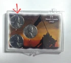 The product is a set of three circulated 1943 Steel Lincoln Wheat pennies from the Denver, San Francisco, and Philadelphia mints. These coins were minted during wartime and are made of steel due to the scarcity of copper at the time. The set includes a variety with a die crack, and it is uncertified. The coins are packaged in a custom pack, providing collectors with a piece of history from the United States during World War II.